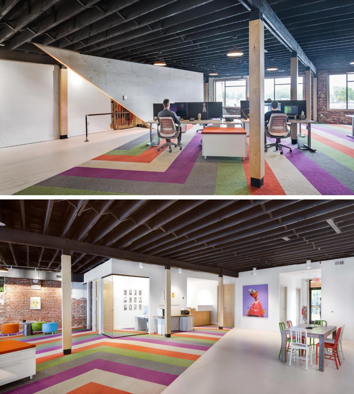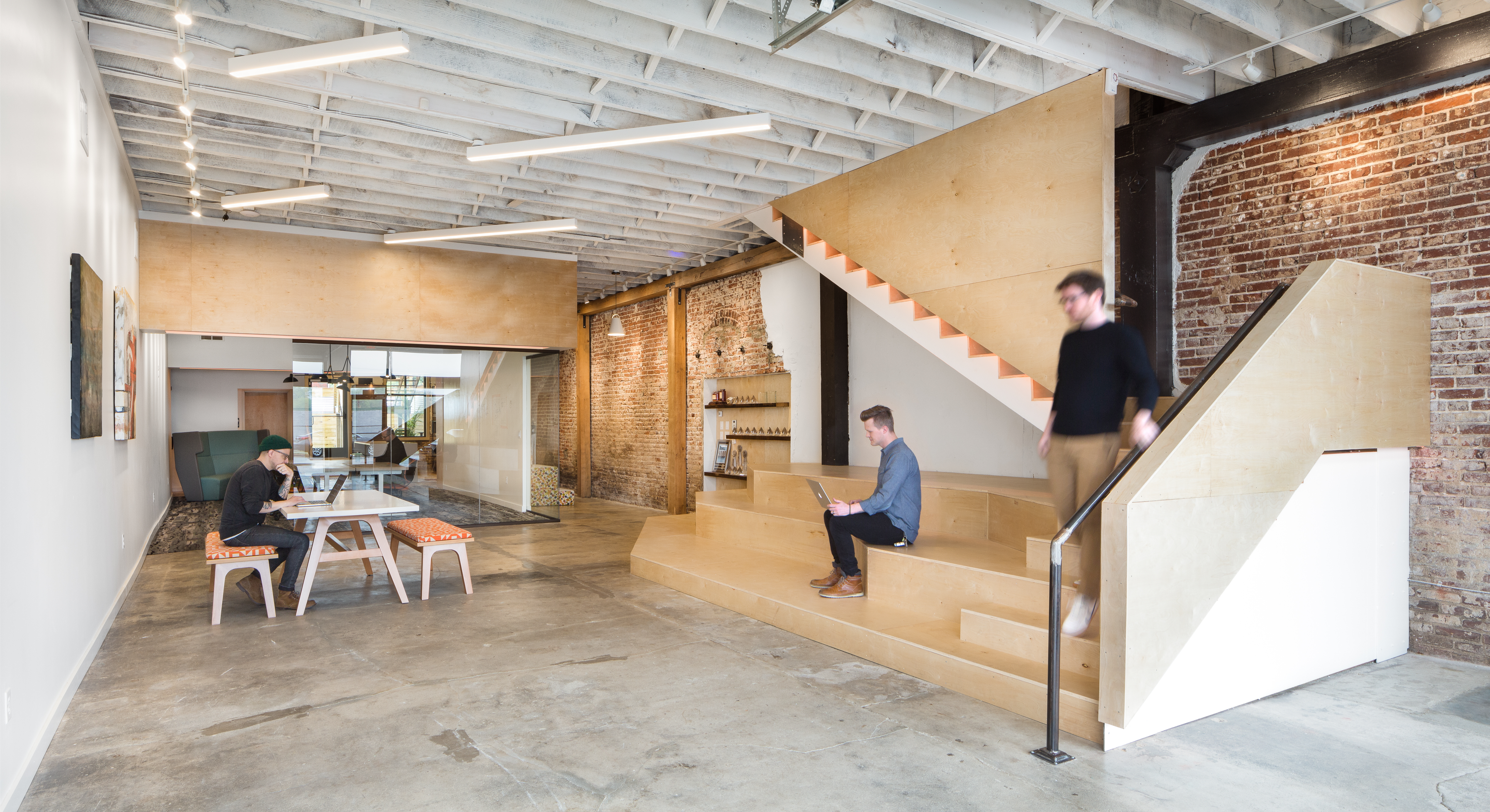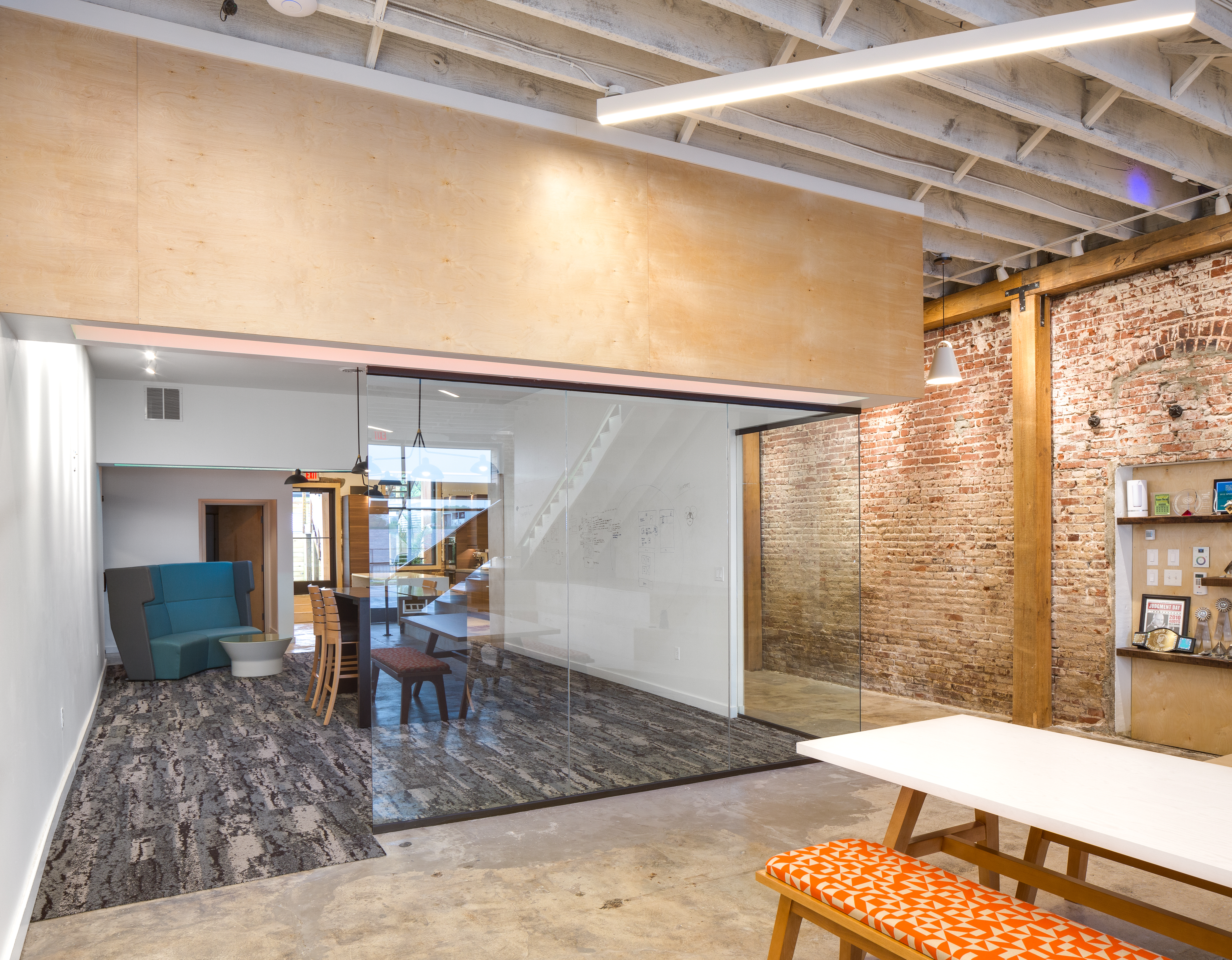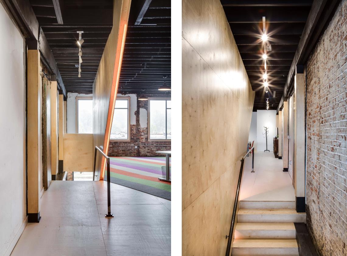 There are two intentionally different environments within the project. The ground level is open and bright as it is utilized for group meeting areas and public gatherings. The second level is designed to encourage a deeper level of individual concentration for product development including website and video production.