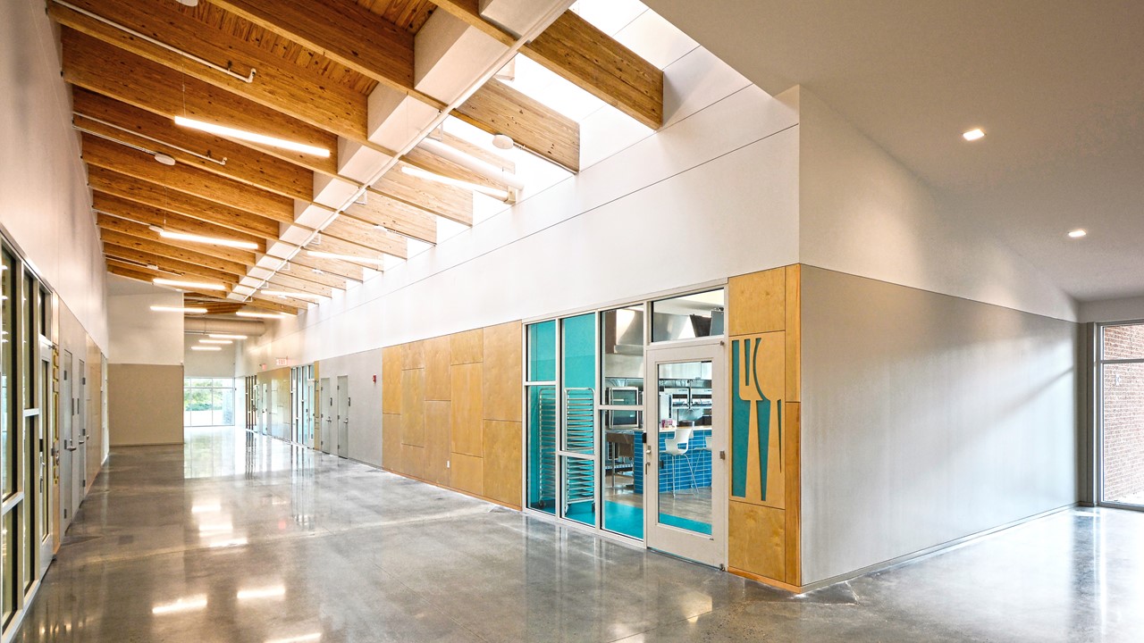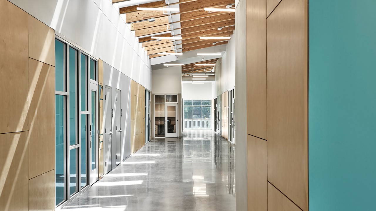 2. Interior Commons - Daylight and naturally occurring materials have been proven to promote a sense of wellbeing, which is ever so important for the development of the organization's students. Plywood wall paneling, and exposed roof structure of glulam beams and wood decking introduce natural materials. A skylight brings daylight to the heart of the building from above; glass assemblies open from the Commons into each primary space; all primary axes terminate in full-width openings with views to the outside.