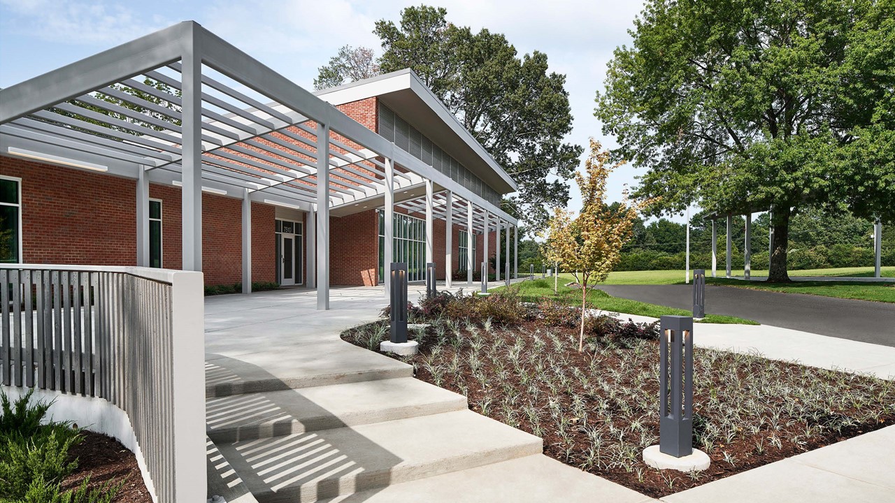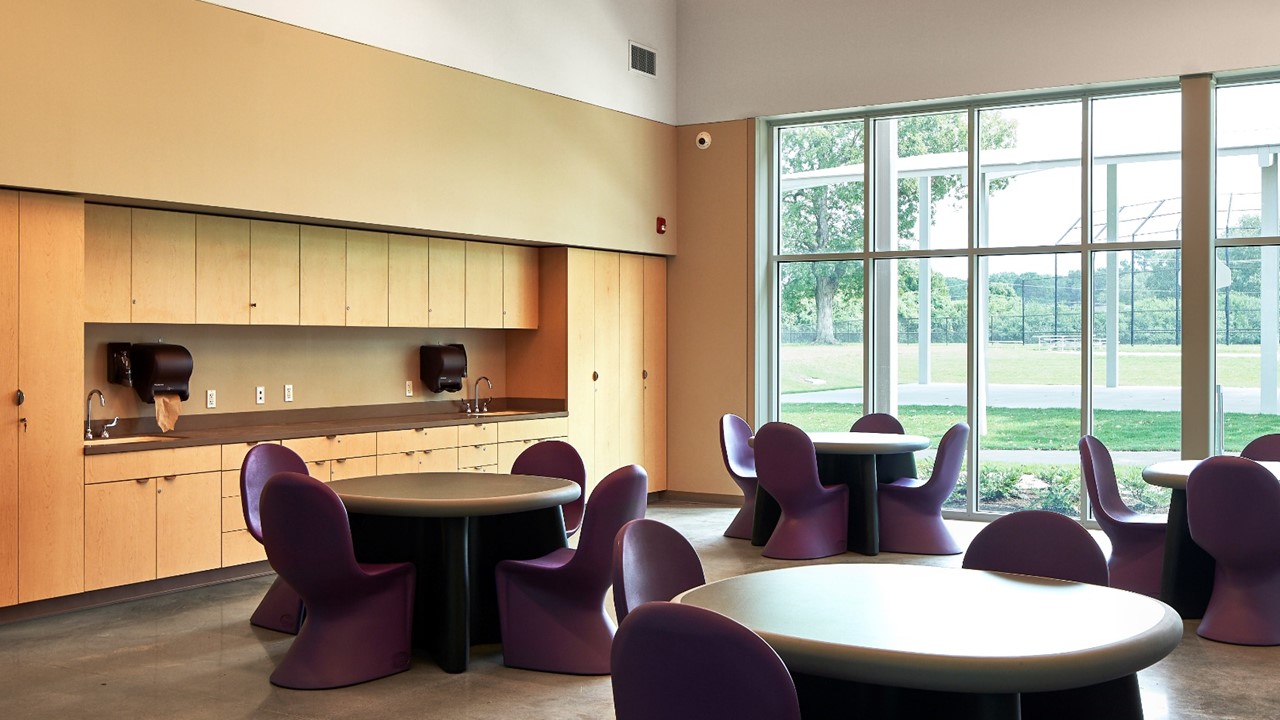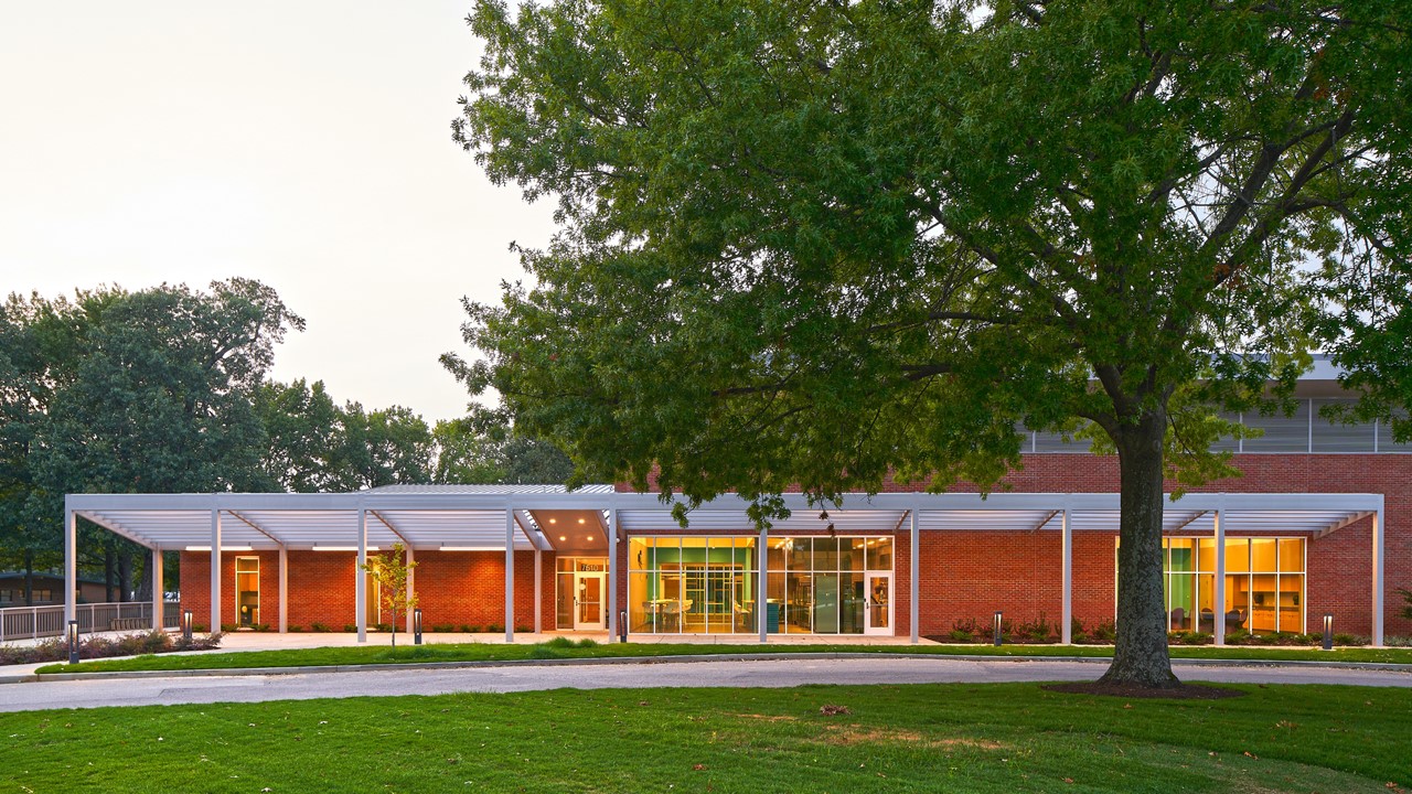The Activity Center introduces a light-filled hub of activity and care programs to the pastoral community campus in Bartlett, TN. The Activity Center is part of a nationally recognized program that supports children’s mental and behavioral health, provides residential, academic, and developmental services for children and teens with emotional, mental, and behavioral problems. Initially designed to house only a specific developmental culinary program, the scope quickly grew as the organization identified the opportunity to include a holistic Activity Center that offered a diverse array of active spaces and treatment centers. On a hill at the nexus between residential “cottages” and educational buildings, the Activity Center negotiates the varying scales with dueling single-sloped roof planes that open upward and outward from the building's center, providing expansive views of the campus. Where the roof terminates at its lowest point, steel trellises mirror the slope, expanding the building form outward and upward once again while providing shade for the plaza, deck, and interior spaces. The varied hues of the red brick façade are contextual, durable, and offer an immediate tactility that contrasts the smoothness of the trellis. Exposed glulam beams, wood roof decking, and plywood wall panels bring a sense of warmth and tactility. An expansive central skylight, interior windows, and central axes that terminate with outward views allow ample daylight across all spaces. These features seek to promote unity and shared experiences between the unique programs offered within the Activity Center