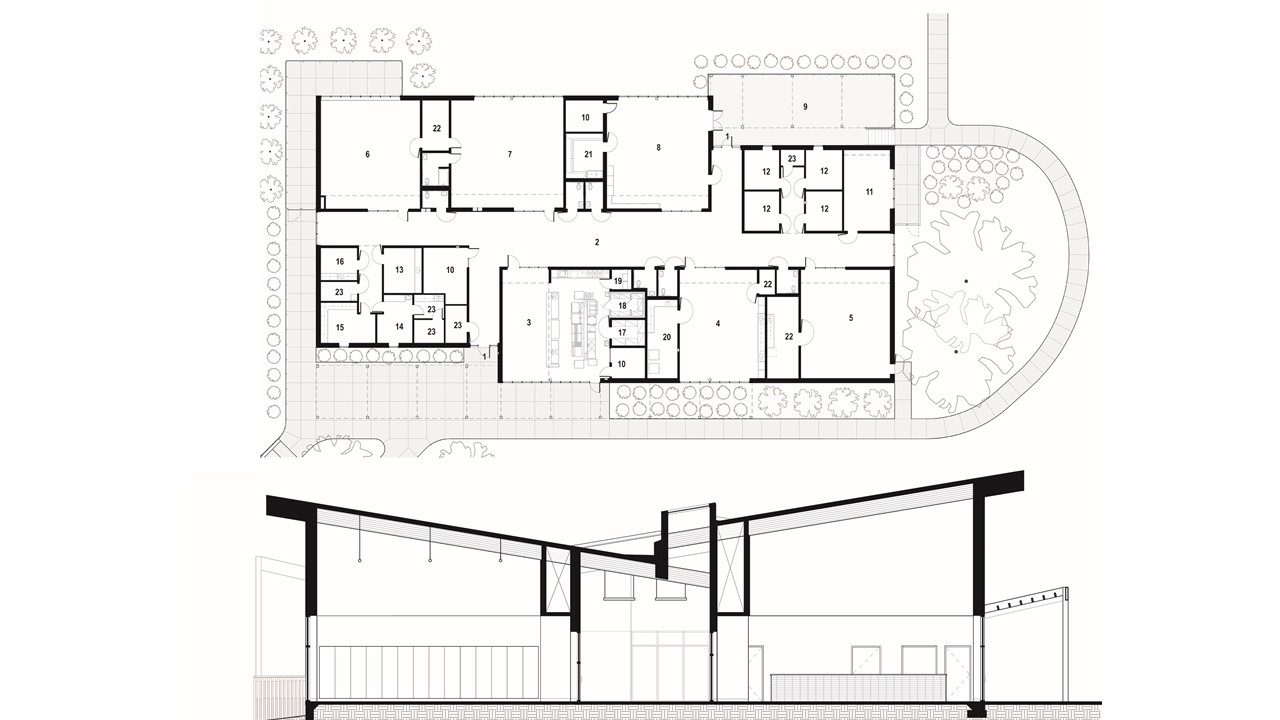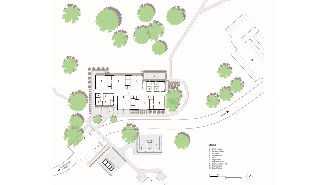 7. Site Plan - The new Activities center is sited to minimize demolition of existing trees and maximize views to the nearby grove to the west, which also acts as a passive solar shading device. This allows warmth and light into the building during the winter months and shading the expansive openings during the lengthy Memphis Summer. Another Key to the siting of the structure is linking programs already present on campus. The activity center is located along an internal street at the transition point from residential " cottages" to larger educational buildings. Students can make the short walk from their residential units on evenings and weekends. Teachers can lead their students from the school without having to load up a van. Two new covered pavilions across the street are places to run, play, and enjoy the outdoors in any weather and at any time of the day.