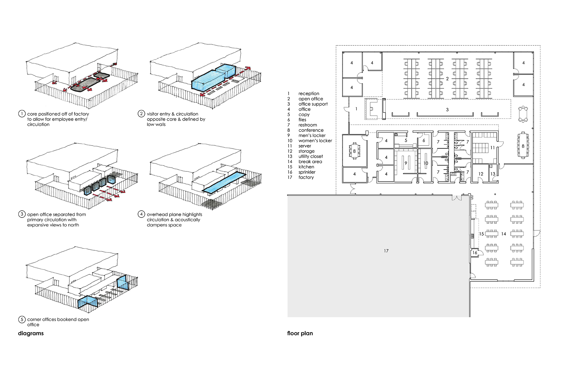 3 - Conceived within the diagrams and visible within the plan is the creation of open, organized, and clearly delineated spatial order amongst the various programmatic zones and spaces.