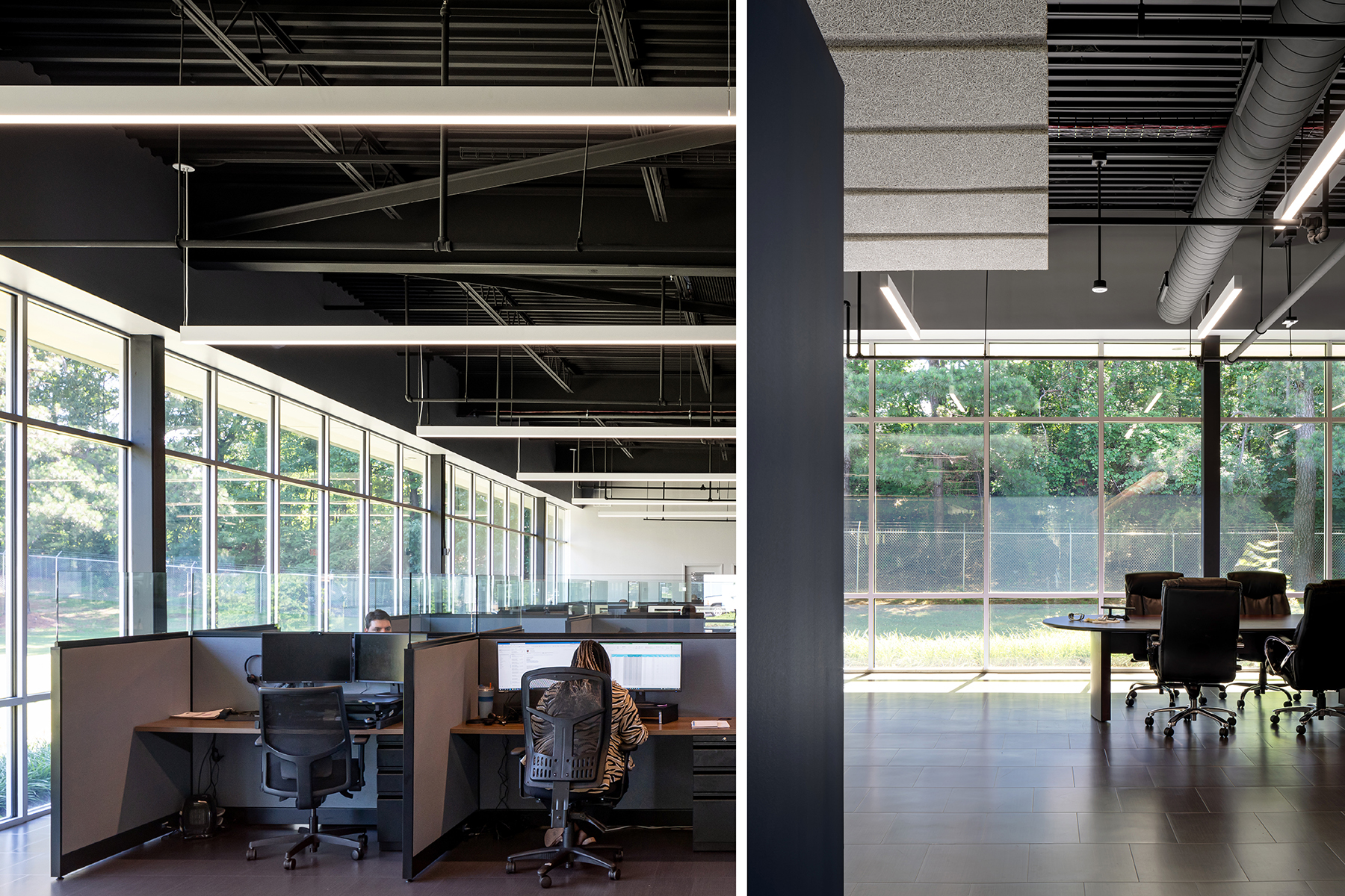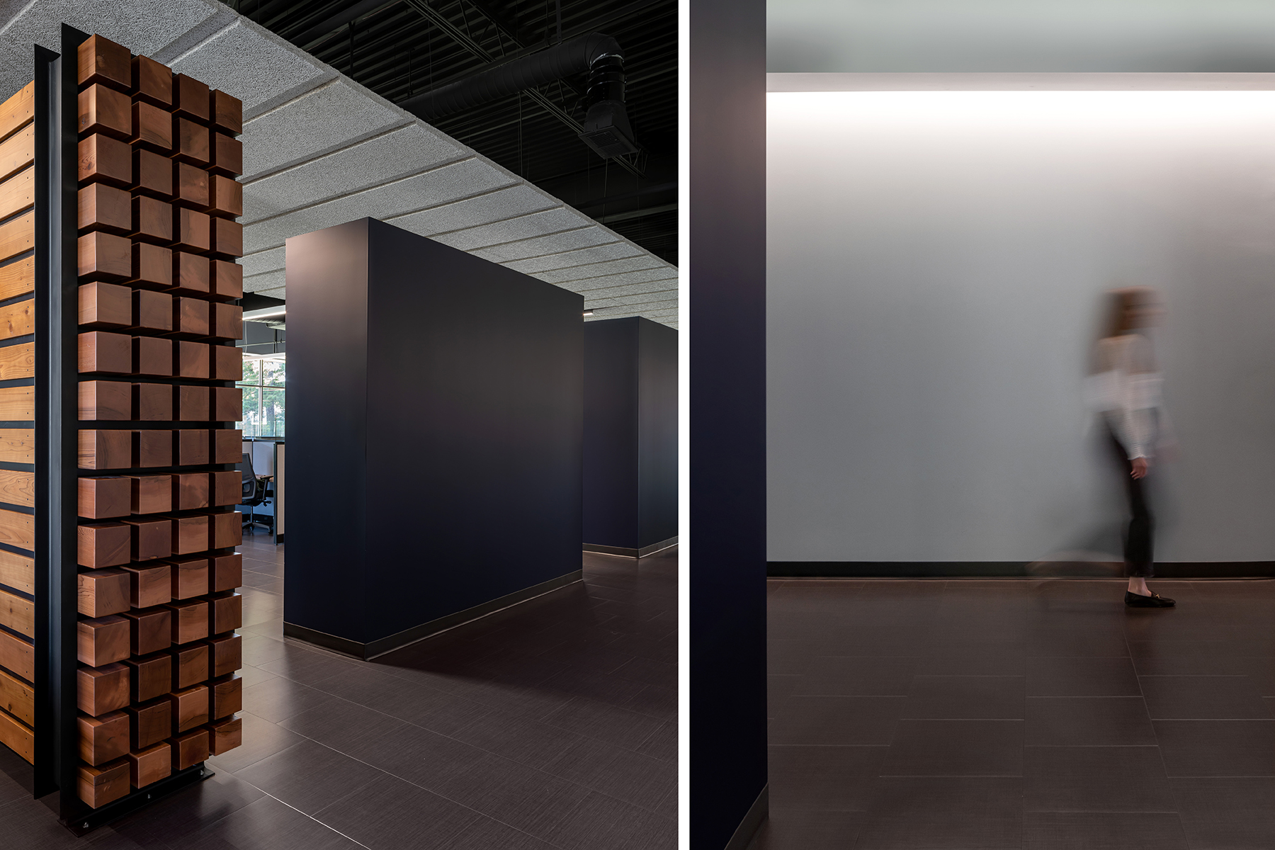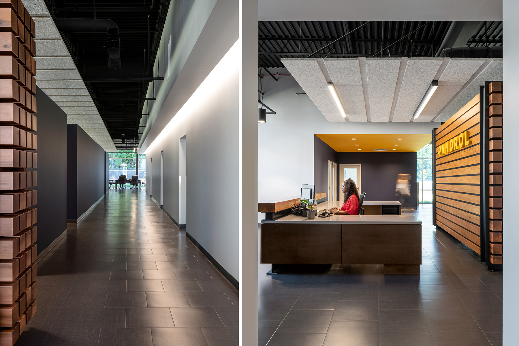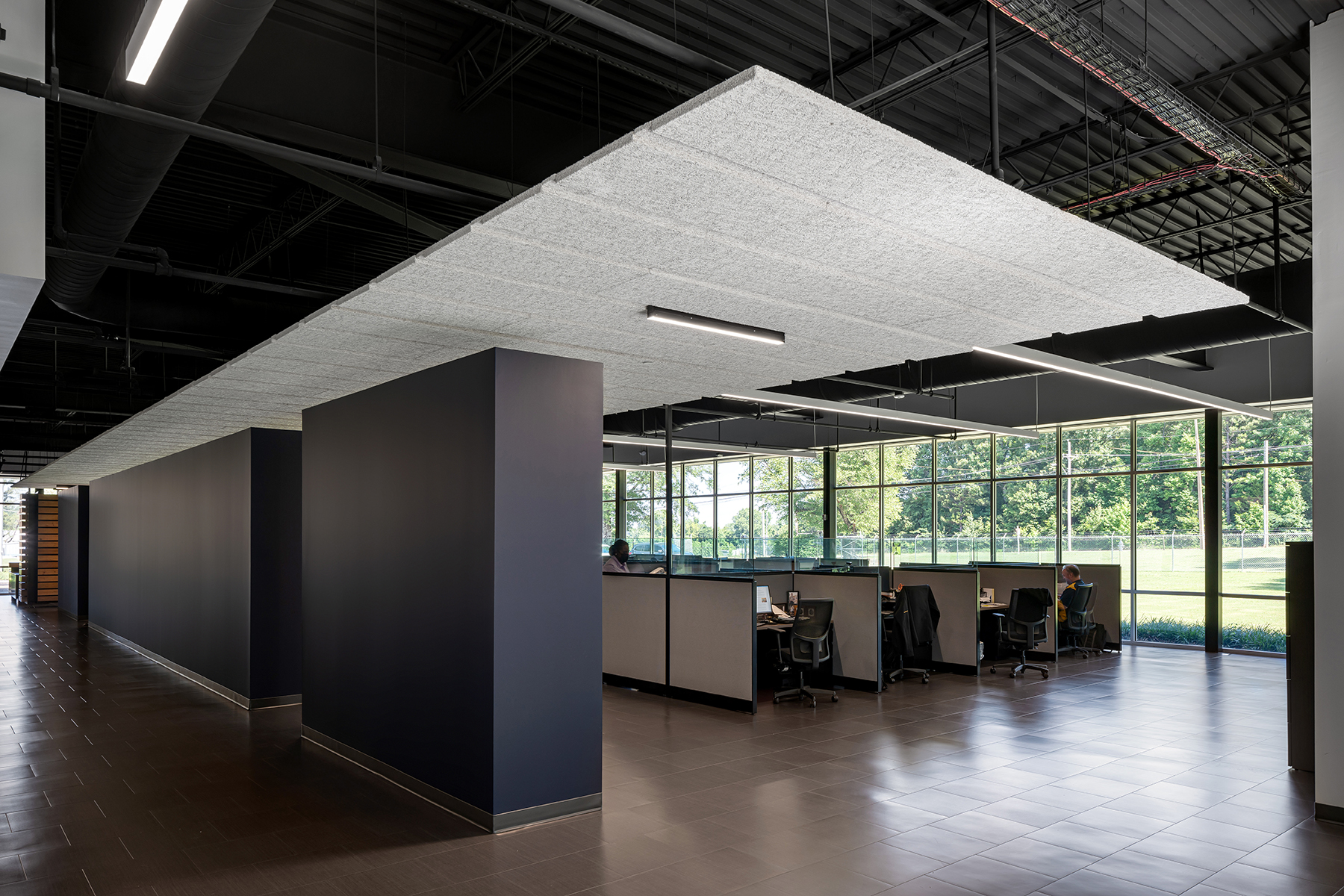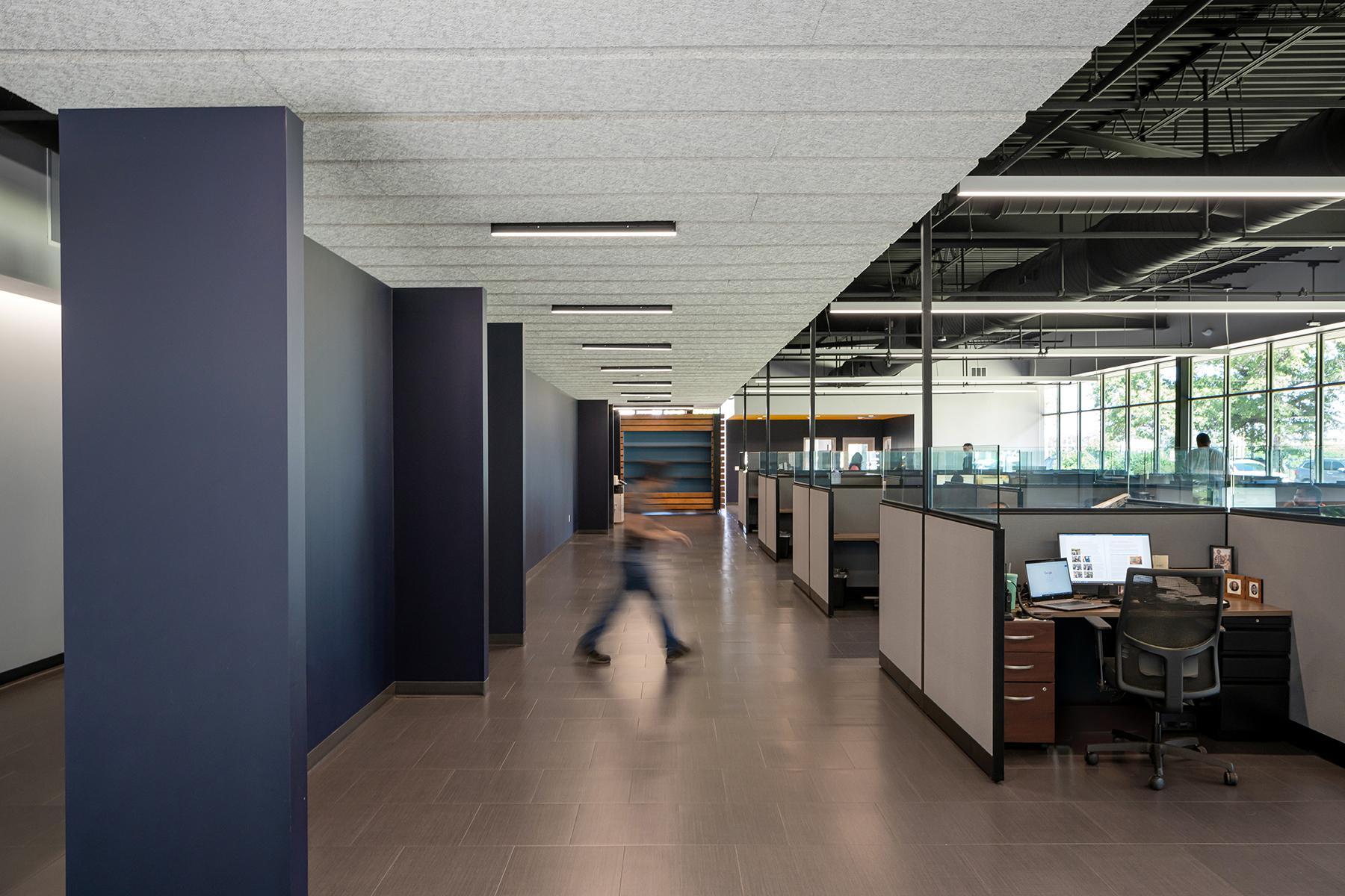 The project involved near complete demolition of all interior walls, finishes, and spaces as well as exterior perimeter walls leaving a steel frame and roof. Serving the needs of both factory and office personnel, a plan diagram was developed positioning the service core between these two entities allowing direct access from each side. Upon entering the office sector from the exterior, an overhead ceiling plane aligns with reception and defines a linear organization to the space. Circulation runs alongside the core, where indirect lighting grazes the gallery wall and offers a soft backdrop. Low walls, whose dark color contrasts with the lighter gallery wall, separate circulation from the offices. The open office receives full floor-to-ceiling glazing on its northern face while being bookended with walled corner offices. Linear suspended lighting floats within a dark, exposed roof structure. Color is used sparingly to reinforce diagrammatic elements and provide small accents to an otherwise tonally neutral palette. Given the nature of factory operations, the owner required a floor surface of sufficient hardness to avoid metal factory shavings from becoming embedded within its surface. Thus, lvt is used throughout. A large break room serves not only as shared dining between factory and office staff, but as informal meeting/social space promoting inclusiveness and team building.