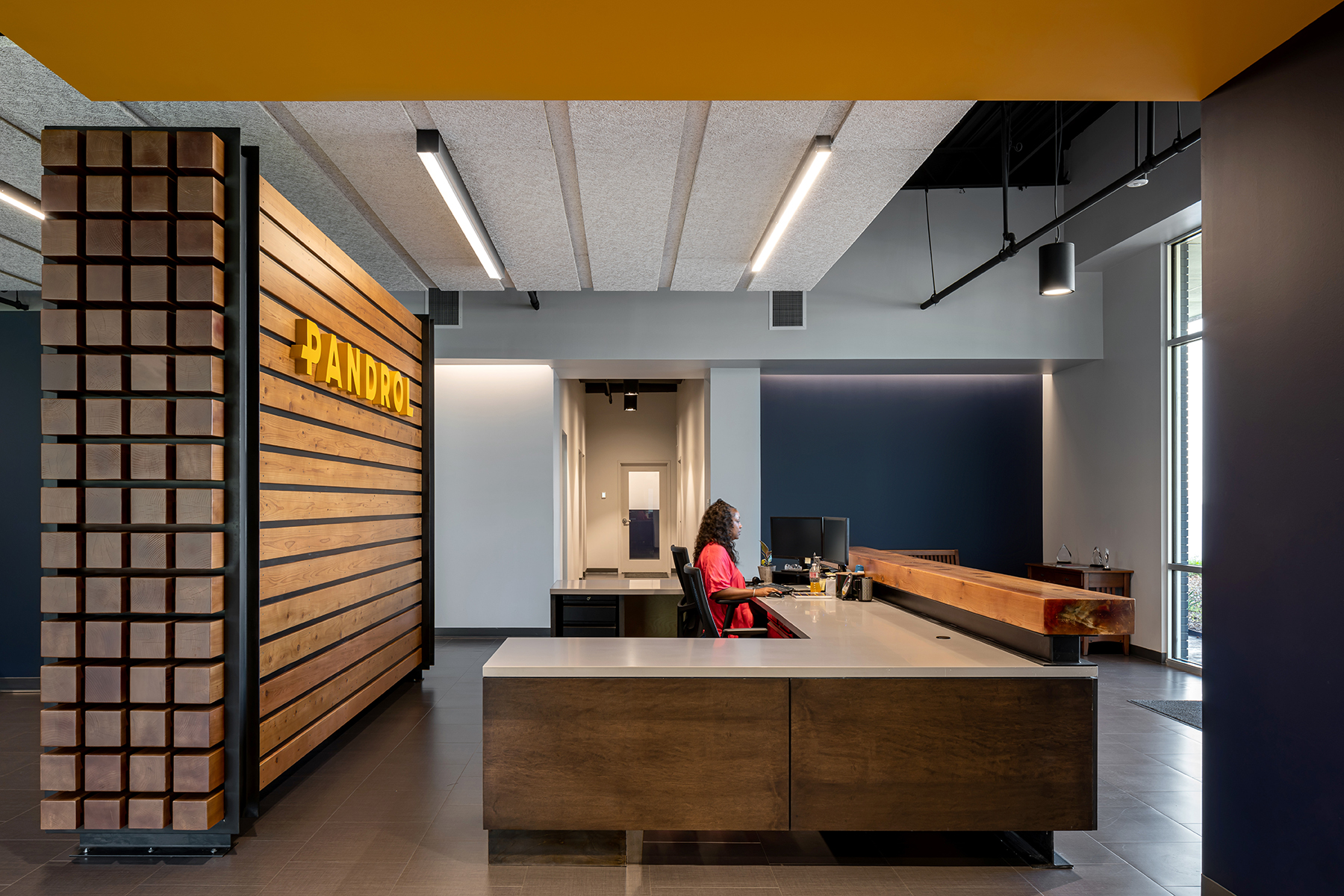 1 - Employees and visitors enter a porous lobby where reception is backed by an assemblage of walls, ceilings, and lighting offering glimpses deep into the space.