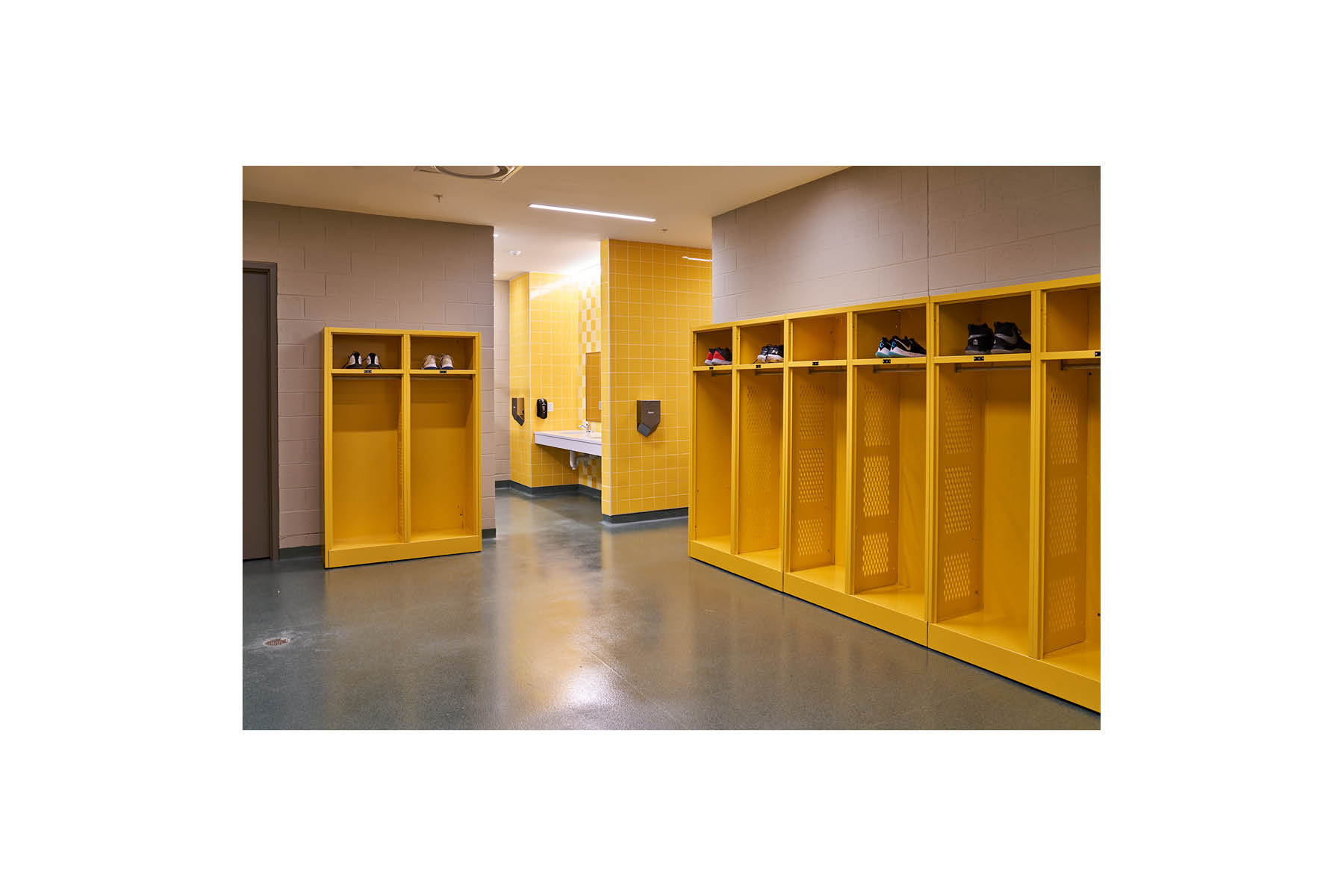 The new JCM Fieldhouse fosters health and wellbeing for students, staff, and the wider community through a wide variety of programs. The gymnasium is bathed in natural light. The shell is peeled back at the gathering lobby to reveal a feature wall showcasing the alumni athletic achievement while the full height storefront invites the outdoors in. The lockers facilities which flank the gym open directly to play fields with ready access to walking paths linking tree canopies with courtyards and inviting students outdoors. The outdoor courtyard reveals a playful mural of paw tracks scaling the façade.