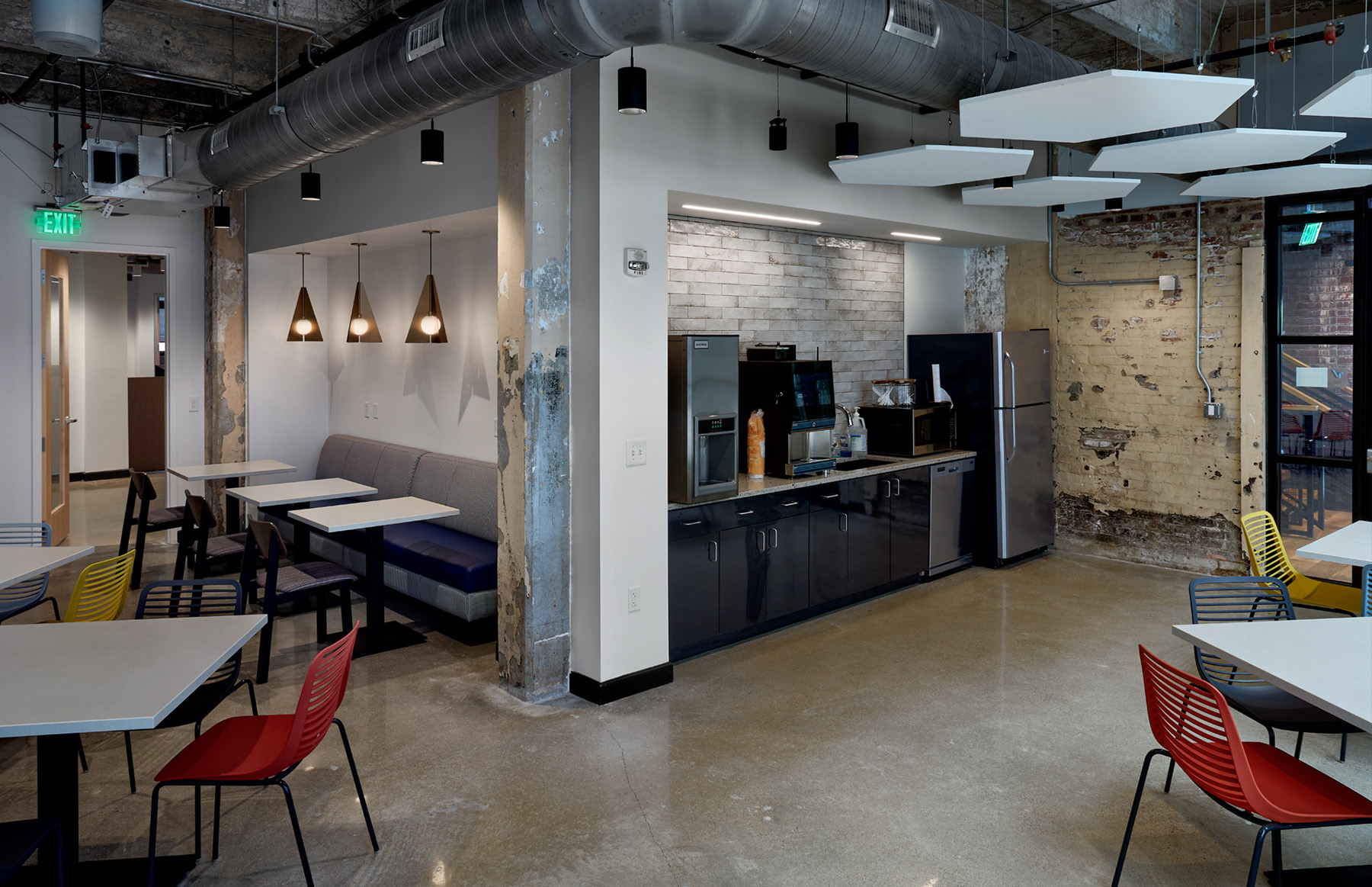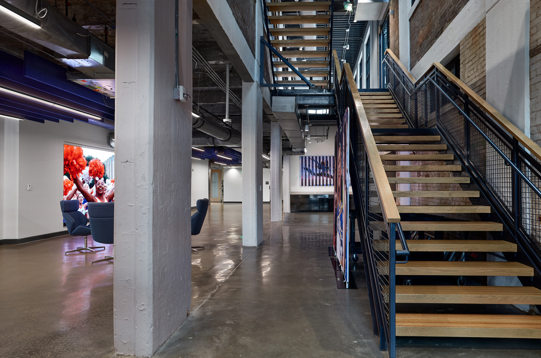 Subtle touches like blue lighting fixtures for the Varsity Spirit brand color subtly conveyed their corporate theme. Cloud-like acoustical ceiling treatments and carpet underneath office spaces softened hard elements, like concrete floors and exposed overhead ceilings. New, engineered wood stairs introduced a warmer touch and paid homage to the buildings’ original wood floors.