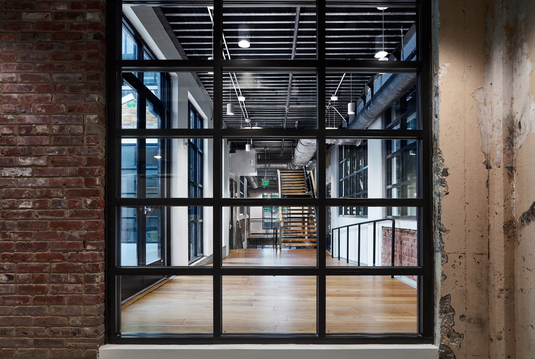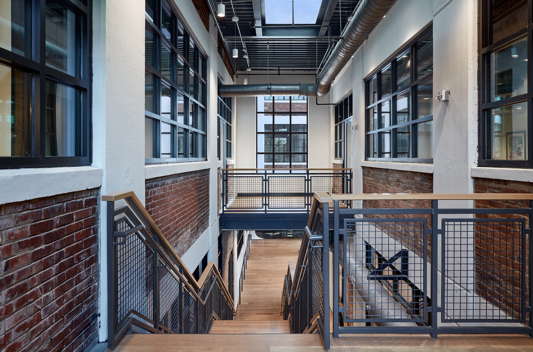 1 - Lobby and receptions area. Photo by Jeffrey Jacobs Photography. 2 - New, engineered wood stairway introducing a warmer touch and paid homage to the buildings’ original wood floors. Photo by Jeffrey Jacobs Photography. 3 - Second floor corridor. Photo by Jeffrey Jacobs. 4 - Employee breakroom. Photo by Jeffrey Jacobs. 5 - Stairway with original doors and other original architectural remnants. Photo by Jeffrey Jacobs. 6 - Interior building connection. Photo by Jeffrey Jacobs. 7 - This connector became a physical and communication superhighway for employees to move between different departments and floors. Photo by Jeffrey Jacobs. 8 - Training room using carpet underneath office spaces soften hard elements, like hard walls, concrete floors and columns, and exposed overhead ceilings. Photo by Jeffrey Jacobs Photography. 9 - First and Second Floor Plans by 4FDesign. 10 - Third and Fourth Floor Plans by 4FDesign.