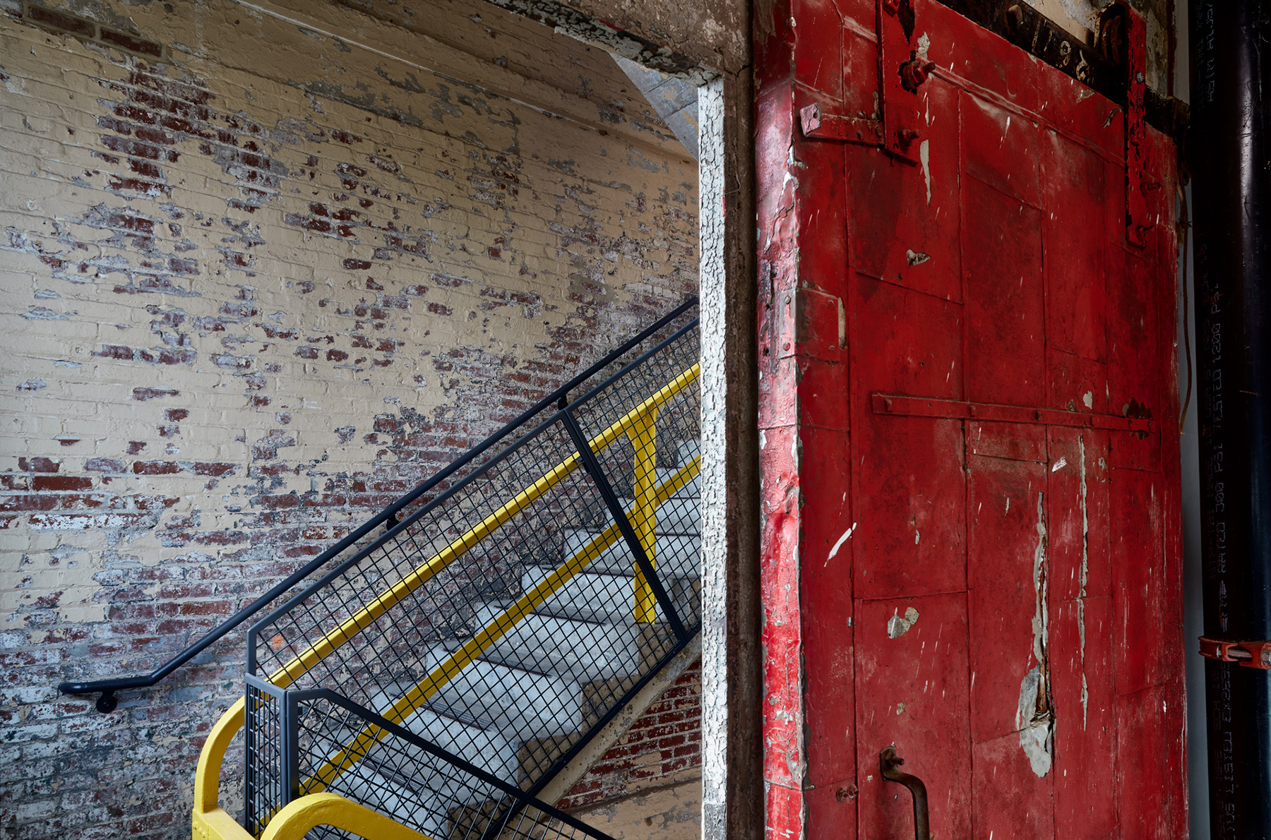 Another design constraint was the space’s original paint scheme; the new design had to leave the original paint and façade intact. That’s why original doors and other architectural remnants remain. Even long-ago graffiti became abstract art.