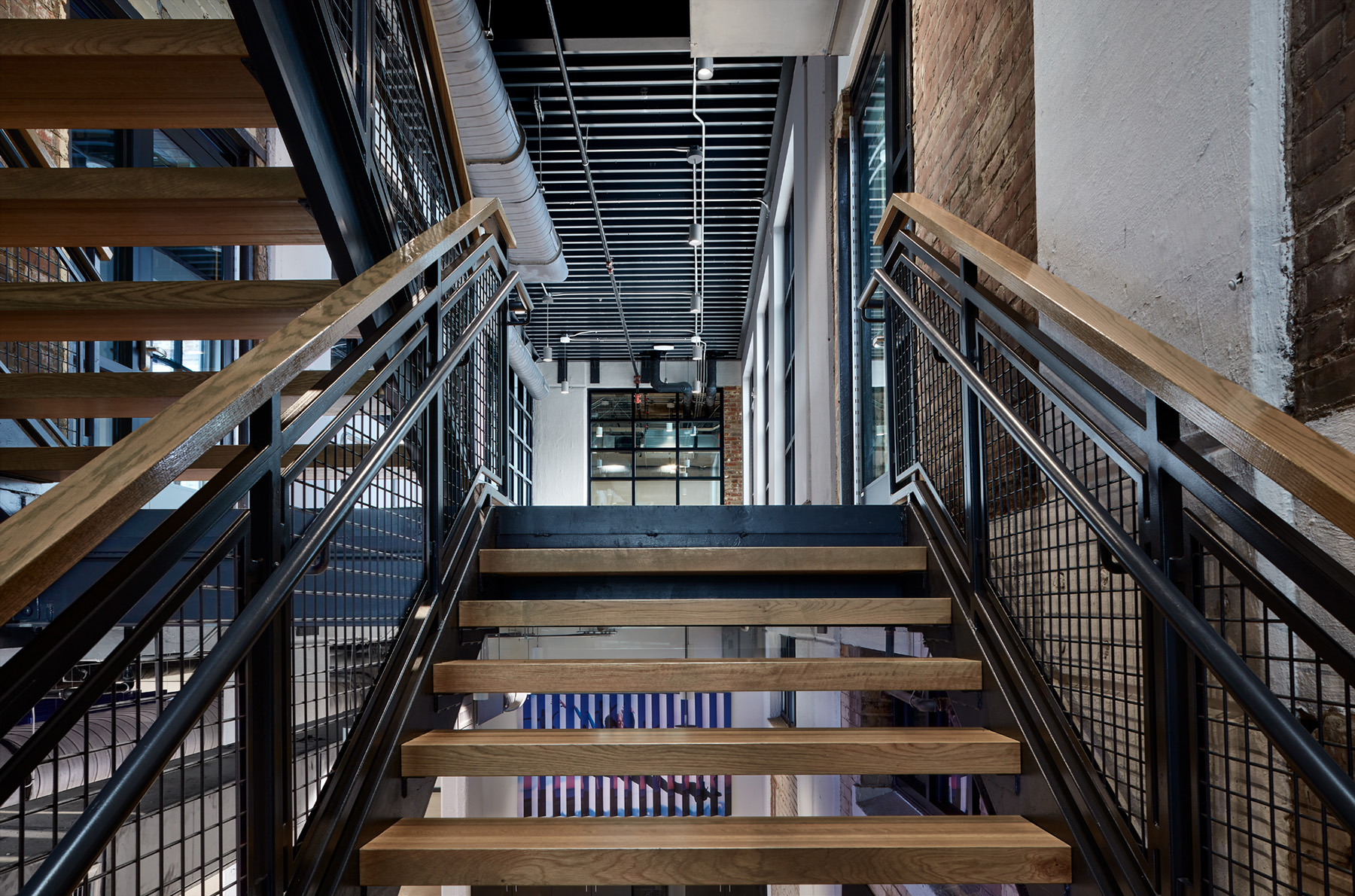 Additionally, what were once yellow columns for designated railways and safe pathways, and red columns for fire prevention areas, were kept as part of the new interiors. The red and yellow were then integrated throughout to other features, like handrails, to maintain remnants of the original purpose for the colors.