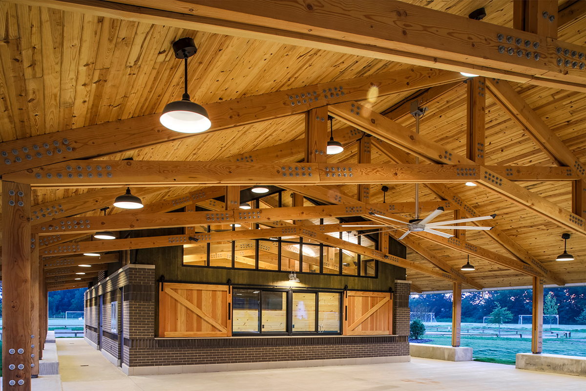Natural columns, trusses, and roof deck visibly continue through all areas