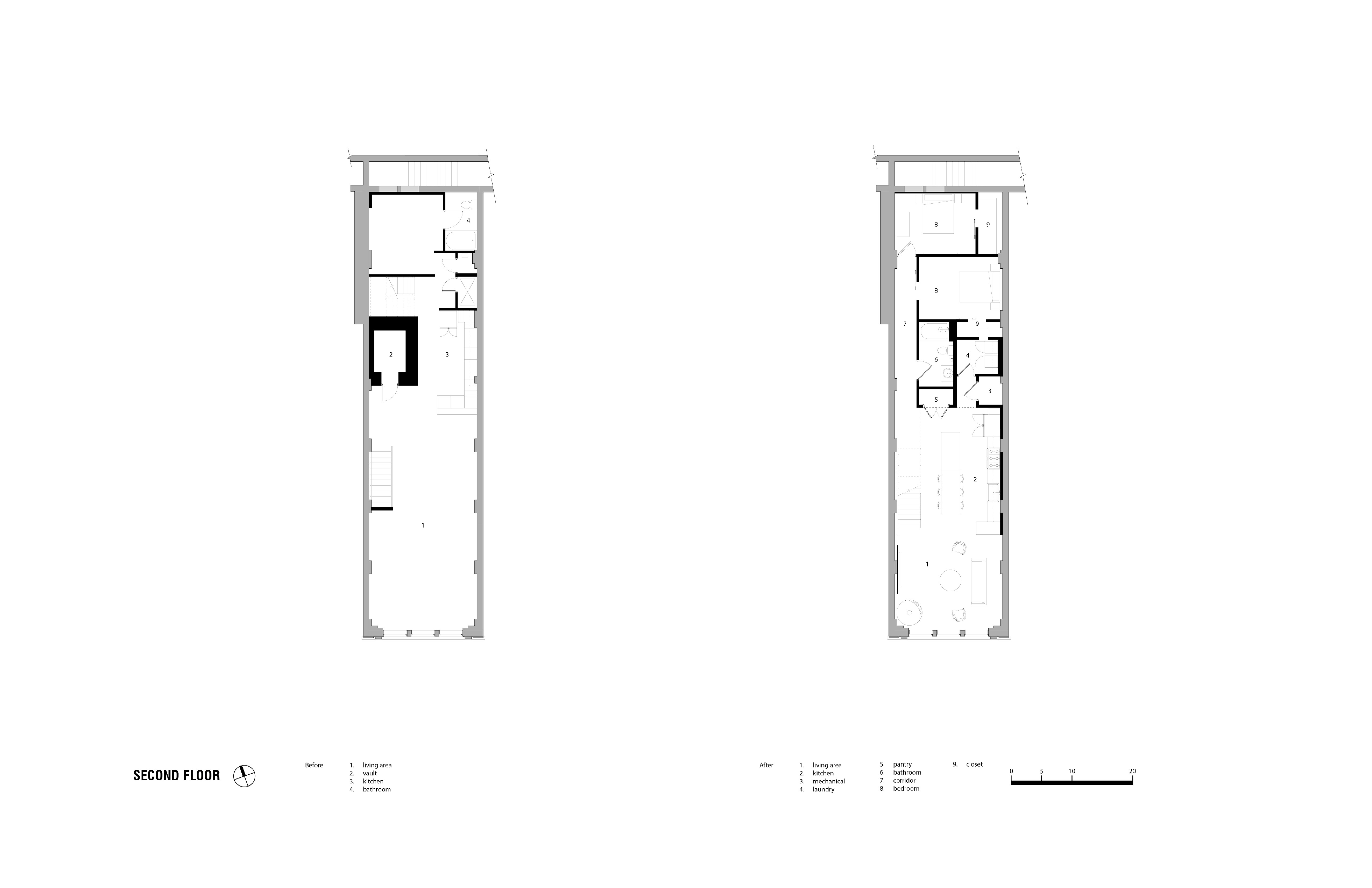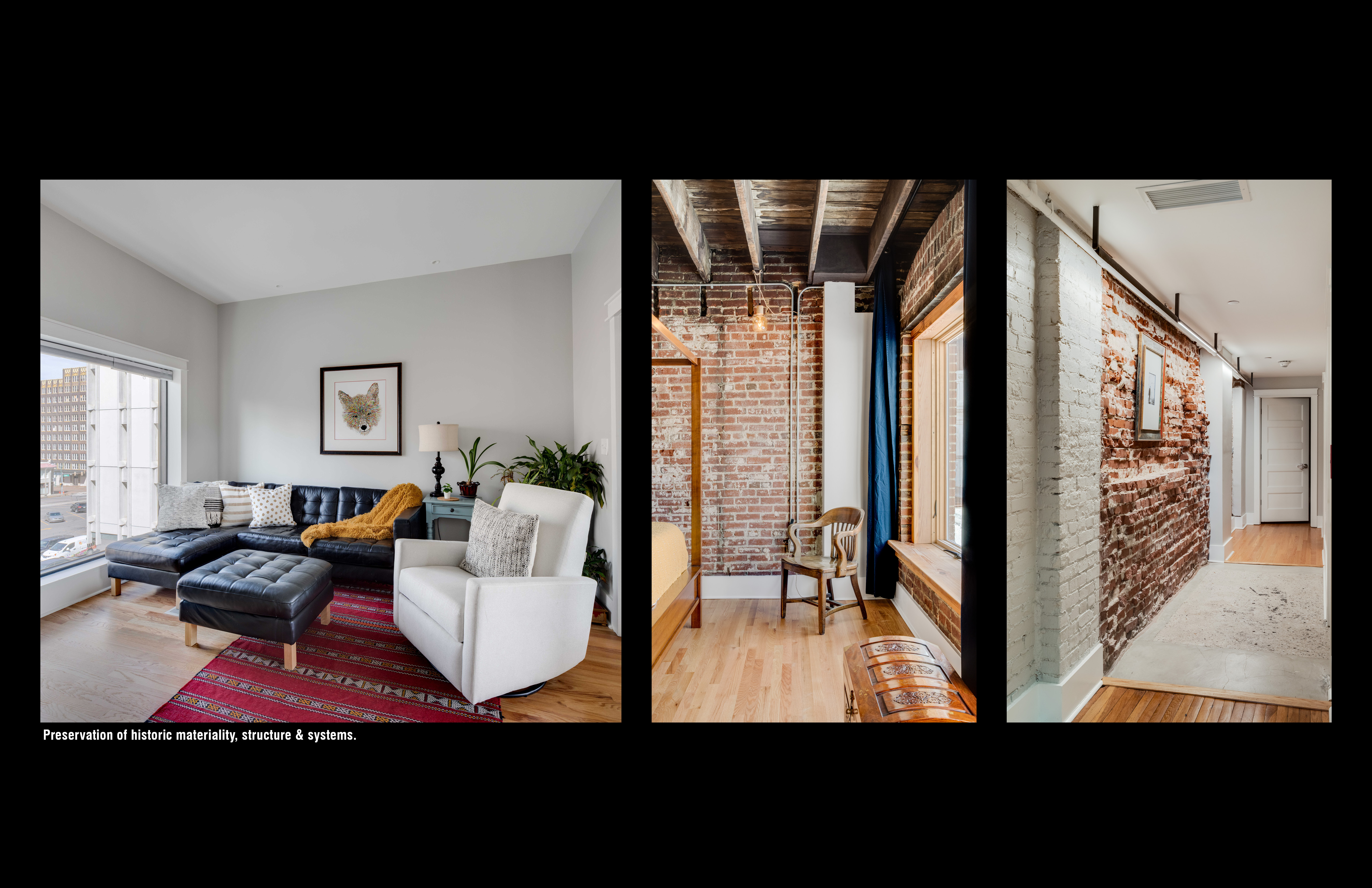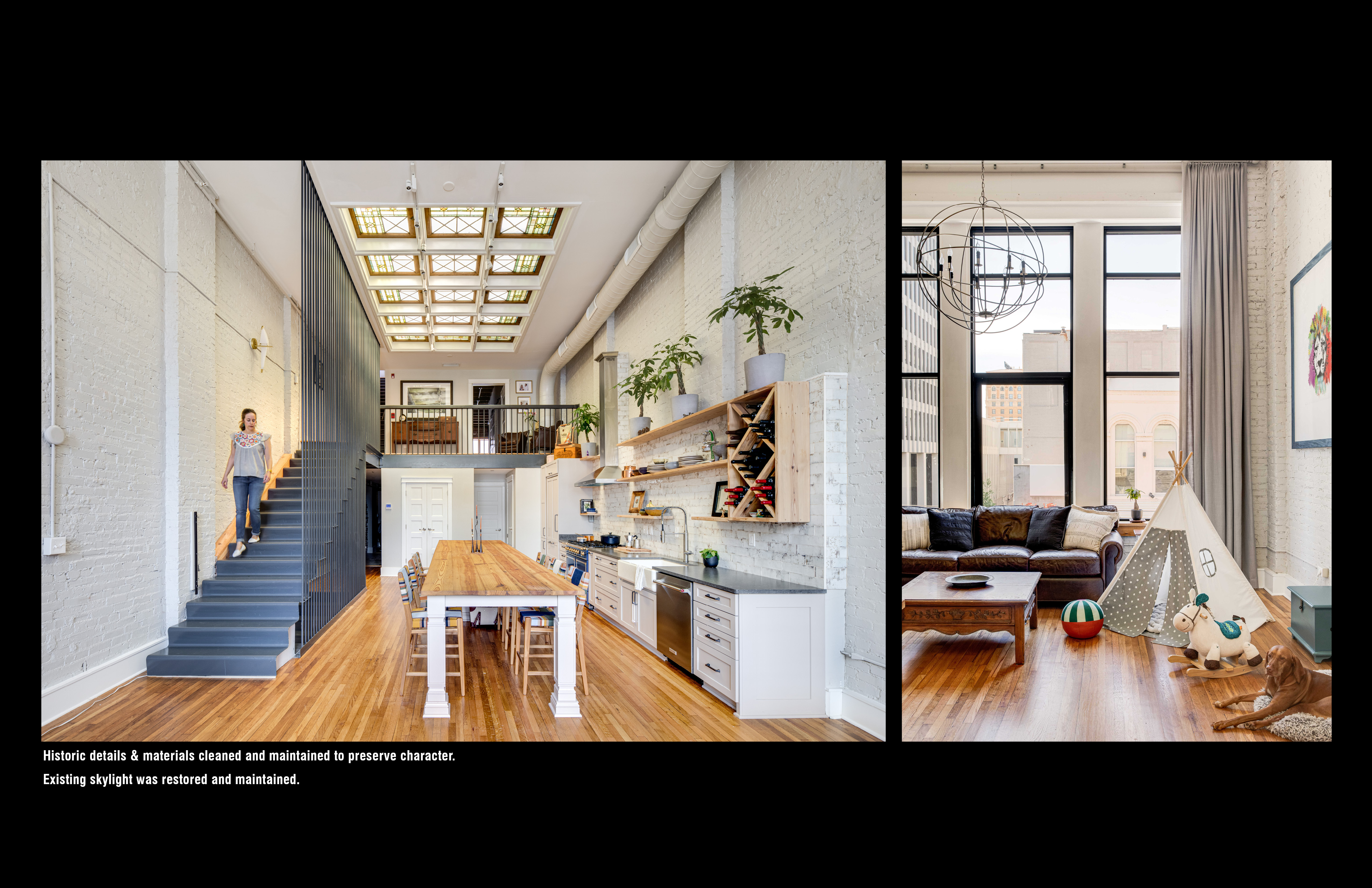 A historic 100-year-old building provided the ideal location for a downtown family’s live-work concept. Originally constructed as a bank, the building most recently functioned as an office and restaurant space before becoming empty for nearly 10 years. The street-level now accommodates a new coffee shop, and the upper floors house the private residence. Historic details and materials were cleaned and stabilized throughout the building. New entry doors, a simple canopy, and a glass garage door were added to modernize the storefront. Exposed brick, tall ceilings, floor finishes, and a light well were all exposed and restored to keep the character of the existing building. To accommodate the expectance of the family’s first child, the existing mezzanine was expanded to create a primary bedroom suite level where two bedrooms were tucked under the floor below. In addition, an enclosed rooftop level was added to the building, and the circulation was reconfigured to maximize usable space. A folded metal stair provides the backdrop for the open entertainment area while providing a circulation slot that runs from the ground floor to the 4th level addition.