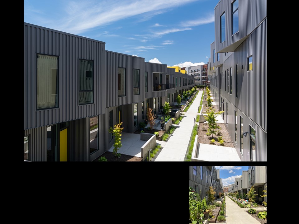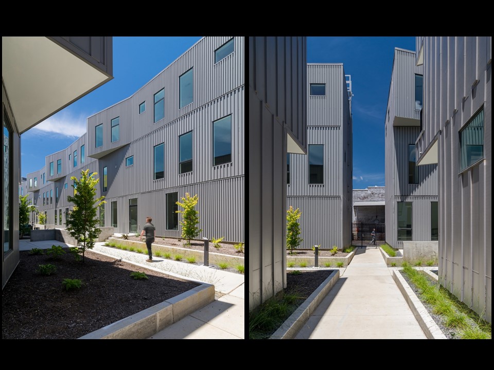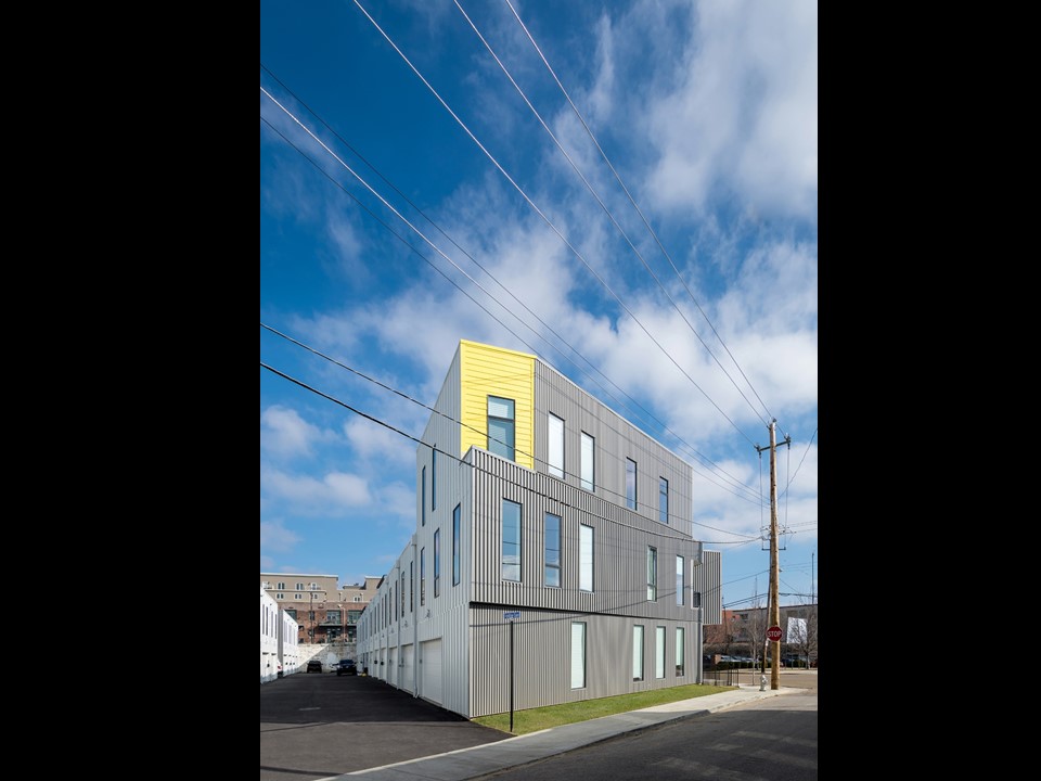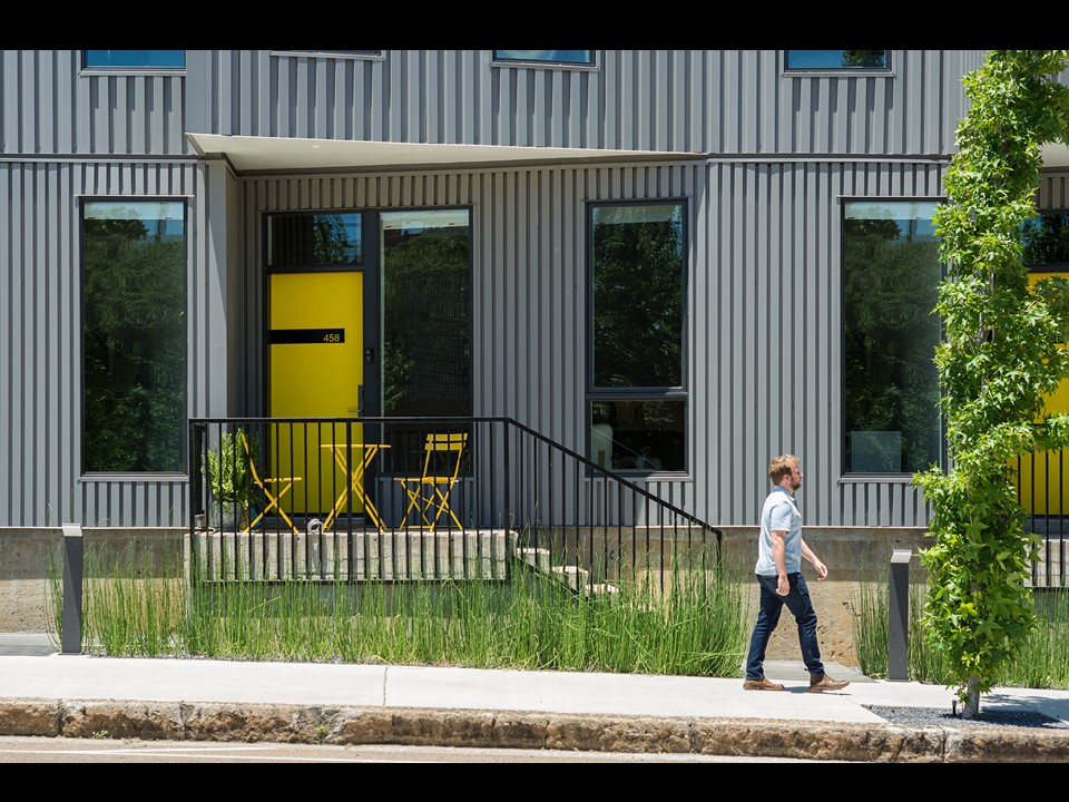The economical site layout is organized into three distinct rows, each with unique relationships to exterior space and the city. The buildings are expressed as a series of stacked volumes clad in zinc grey box-rib metal at levels 1 and 2, and topped by bright yellow volumes of fiber cement board and batten. The 3rd level disengages from the rigor of the contextual urban street front and imbues the streetscape with an informal, dynamic character. The rhythmically undulating façade, everchanging with light and shadow, remains the primary spatial and visual driver, with materials that are inherently sustainable.