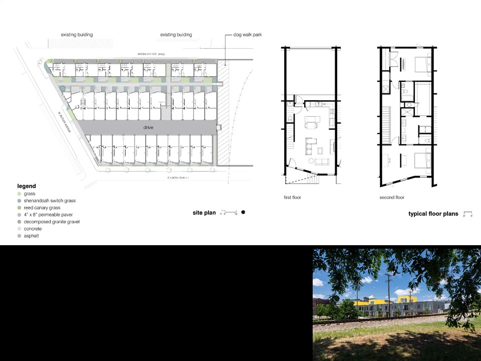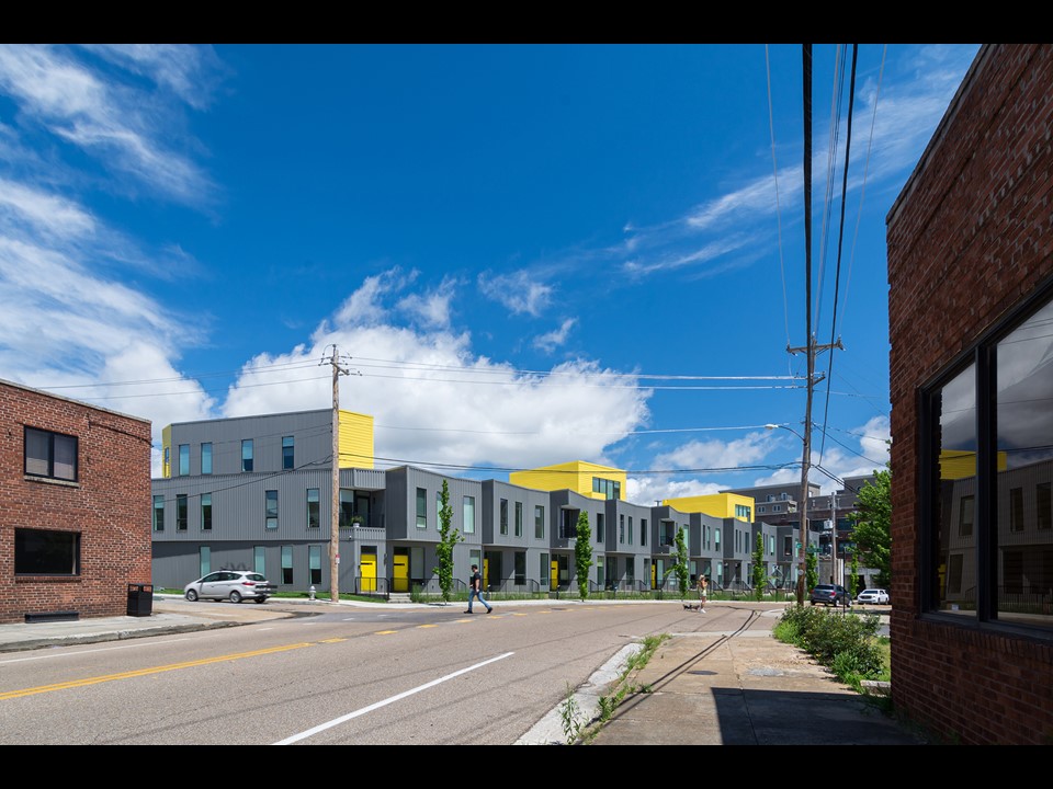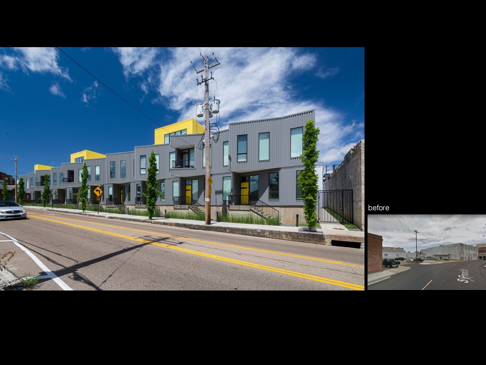 The architect and owner/developer took a 1.25-acre industrial site between a vibrant arts district and the Mississippi River bluff and designed an urban community unique to the downtown area that creates new connections within the historic district. The 30 single-family zero-lot-line townhomes promote a more sustainable, community focused development. Because the project completely fills an urban block, the site and orientation is critical and therefore the building footprint hugs the site’s perimeter with an amount of relief analogous to the surrounding context.