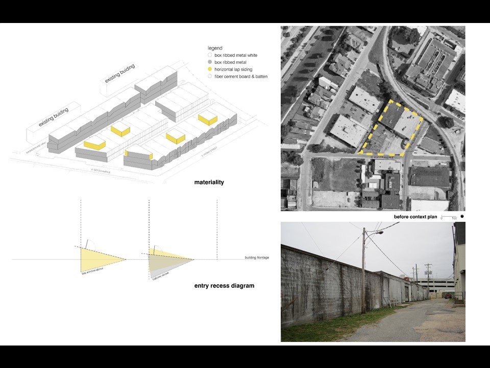 A traditional front-porch narrative was introduced fostering connectivity and community within a typology that often supports isolation and indoor living. A 27’ tall courtyard with textural landscaping and various levels of undulating walls are at its heart. The program addresses urban renewal, density, and inner-city housing by drawing on the relationships between the buildings, site, and neighborhood. The resulting program balances privacy and connectivity through an undulation of forms and landscape.