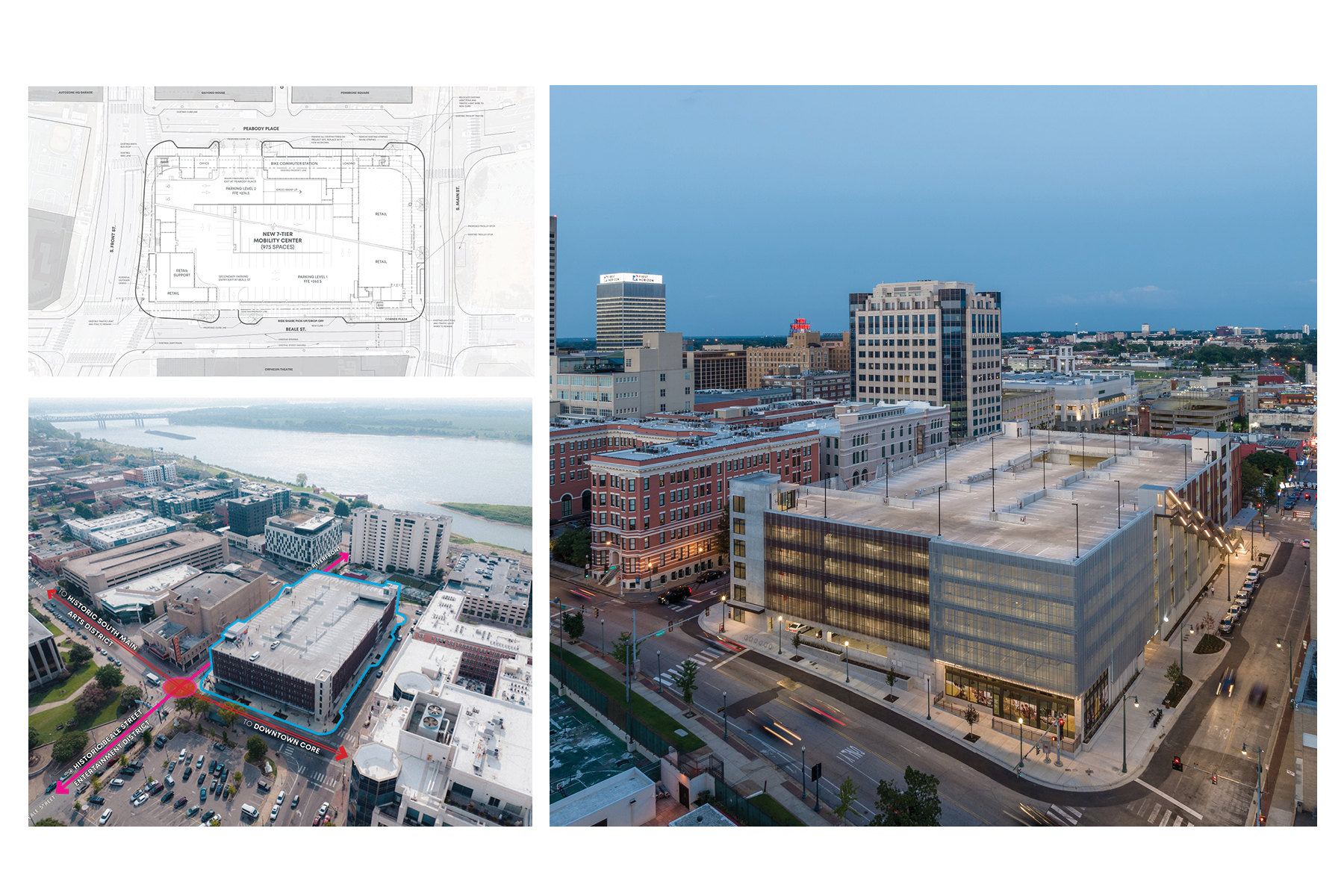 The Downtown Mobility Center converts an underutilized surface parking lot into a much needed mixed-use transportation facility in the heart of Downtown Memphis, transcending the traditional functions of a parking garage.