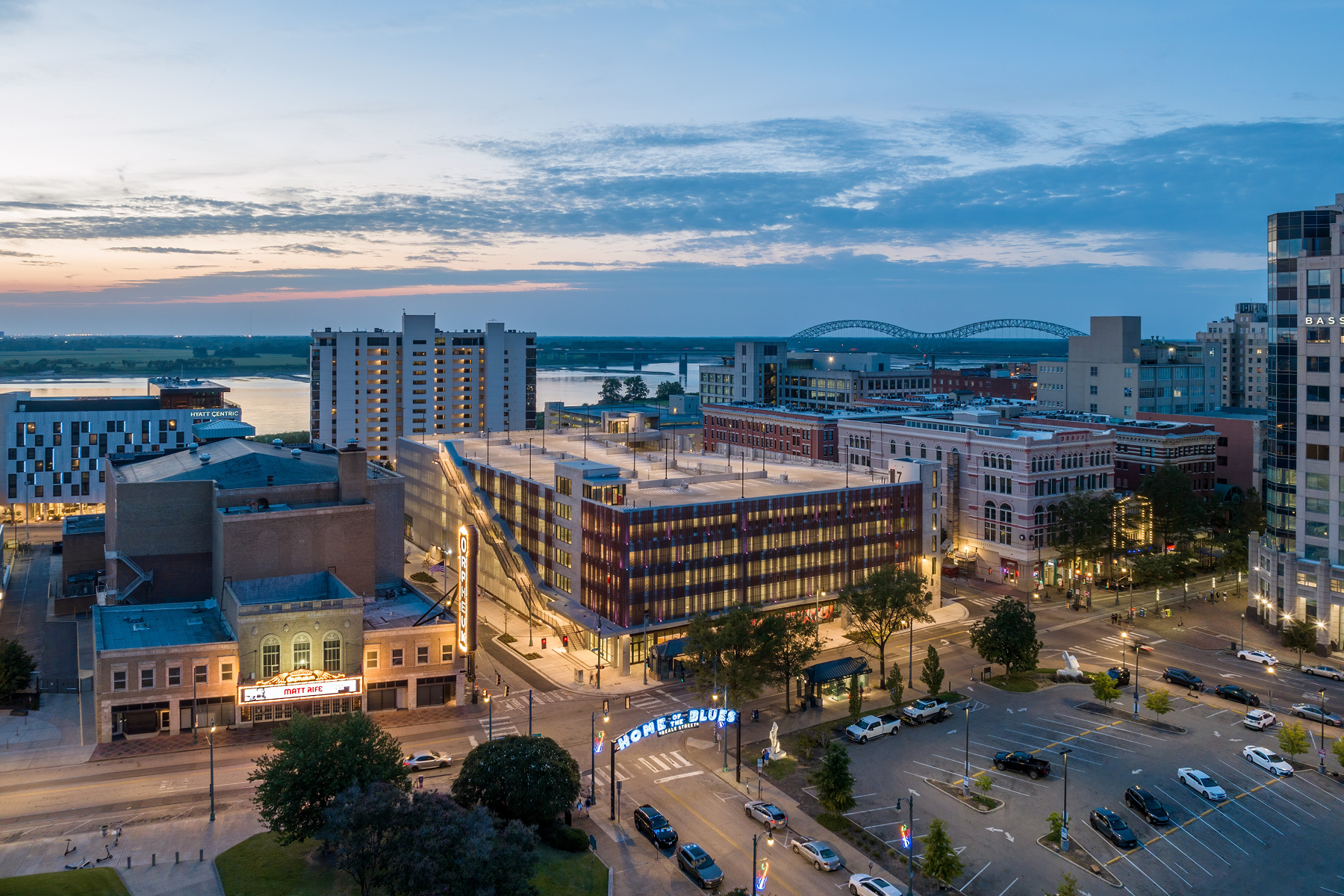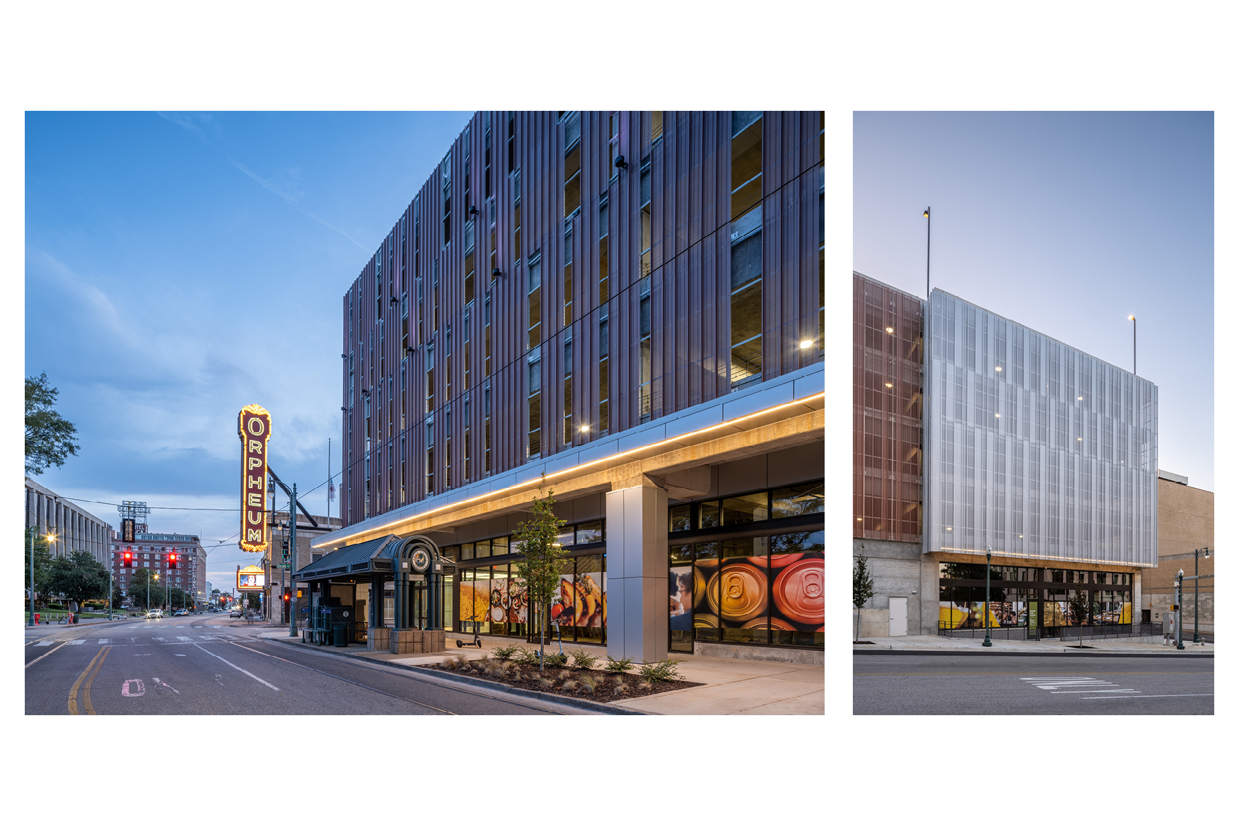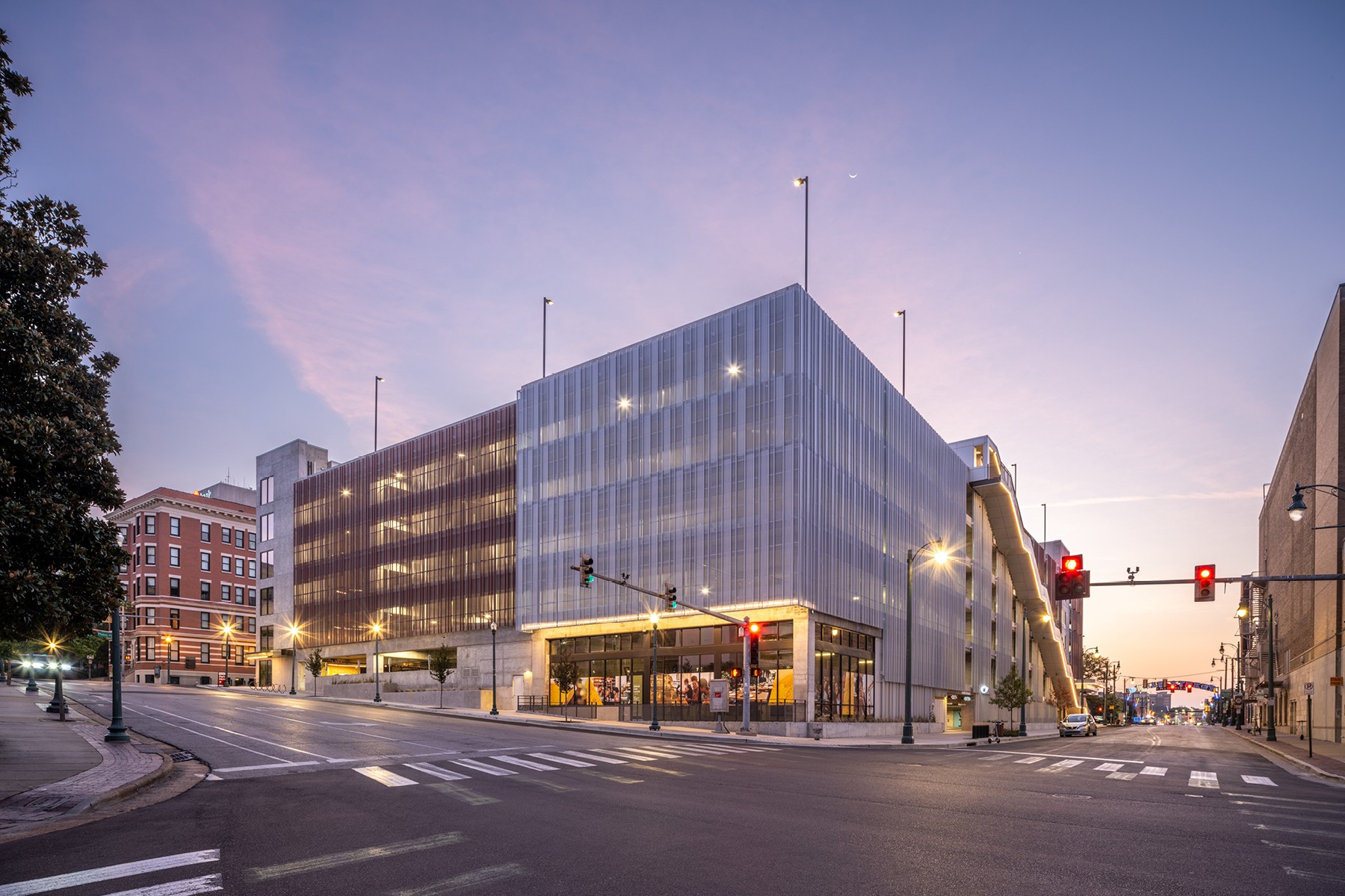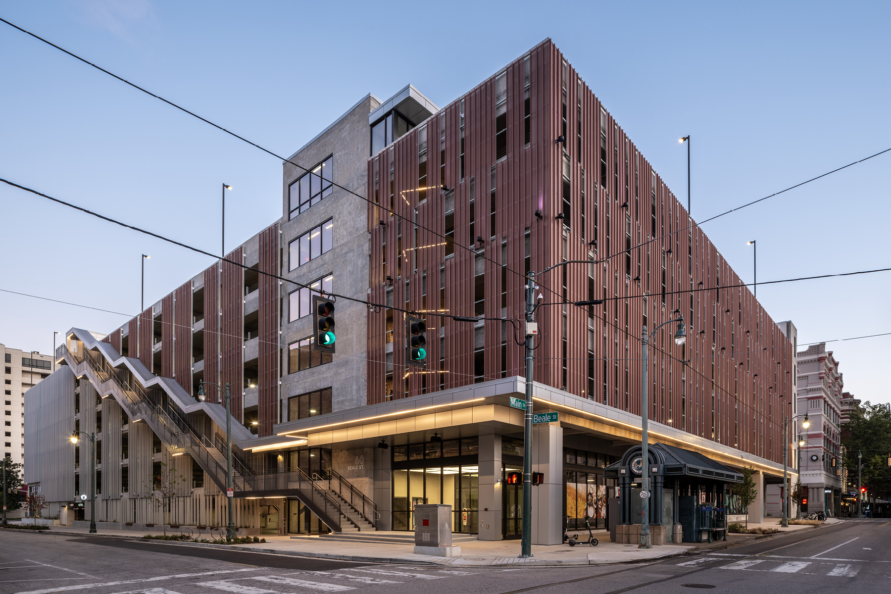Given the prominence of this site, the project enhances pedestrian and trolley connections from iconic Beale Street to the recently renovated park along the Mississippi River and from the South Main Arts District to the transformed convention center north of Downtown. The design process was sensitive to the historic surroundings and purposefully responded to the residential and historic and modern commercial context. With major street frontage on all four sides of the site, the façade is wrapped with a cost-effective perforated metal panel system to help break down the scale of the building and screen the view to vehicles from the street.