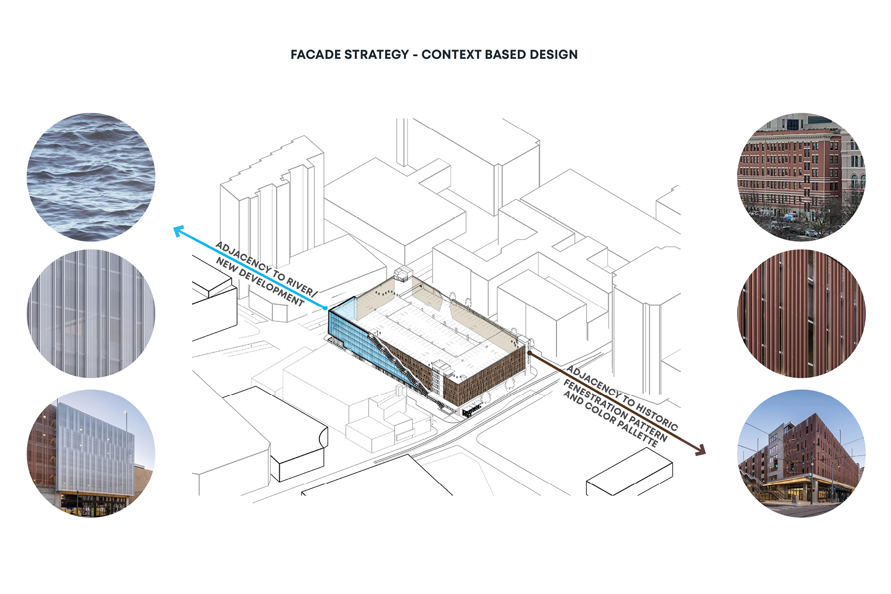 4- The retail space steps back along Main Street allowing for pedestrian flow around the existing trolley stop. Rhythmic placement of the metal panels mimic the openings of neighboring buildings.