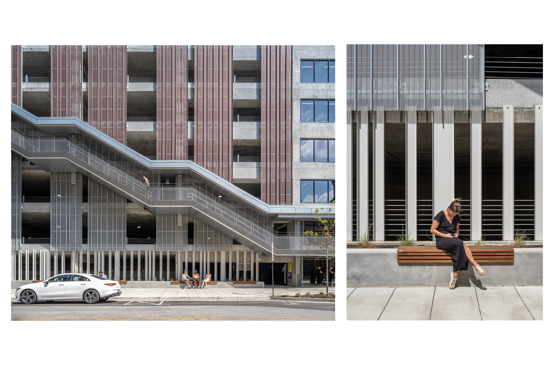 7- Pedestrian movement is expressed through the cantilevered monumental stairs. A landscaped seat wall directly below offers a moment for rest along the widened sidewalk.