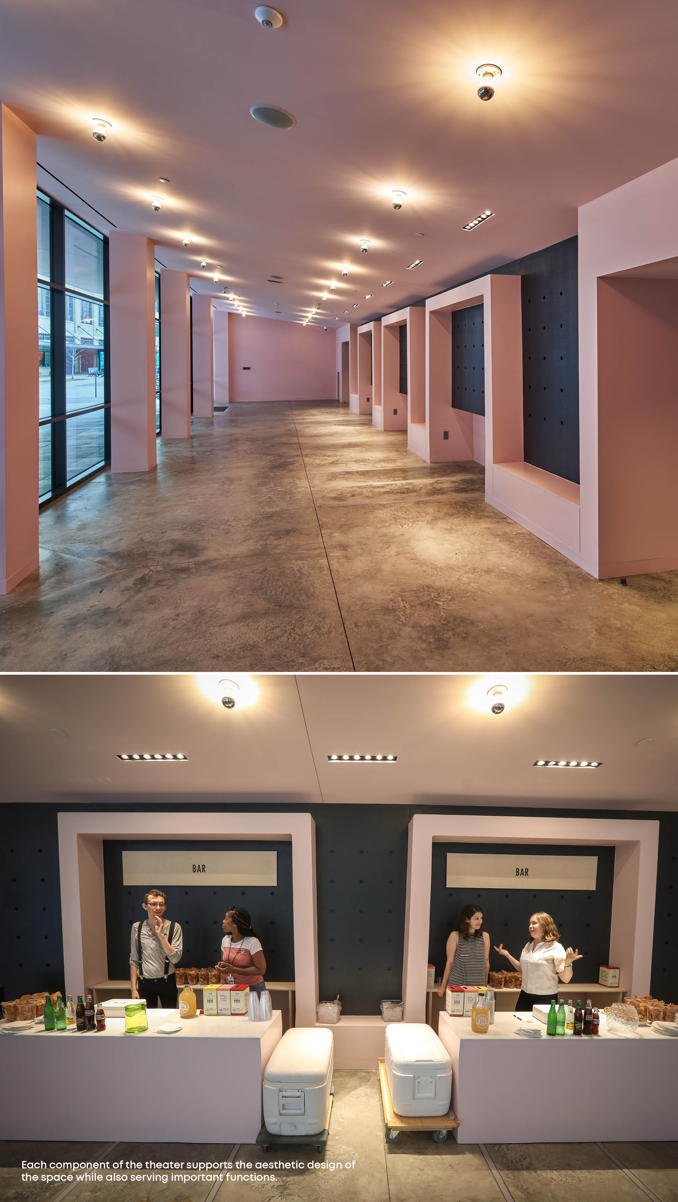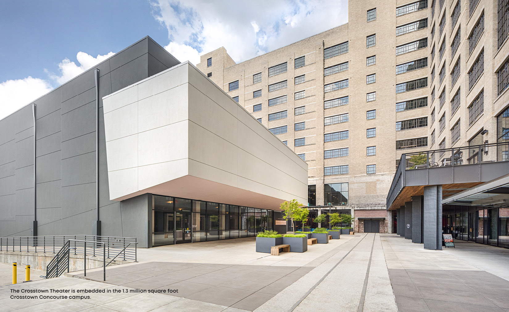 The Crosstown Theater, symbolically built on the foundation of the original powerplant, is the heart of Crosstown Concourse, providing energy and soul to the development. The Concourse’s exceptional cast of public spaces and dining venues, provide a welcoming, accessible, and community-centered pre-function experience for the theater. In addition, the theater complements Crosstown Concourse’s adjacent 40,000-square-foot contemporary arts center, enabling intense interdisciplinary collaboration.
