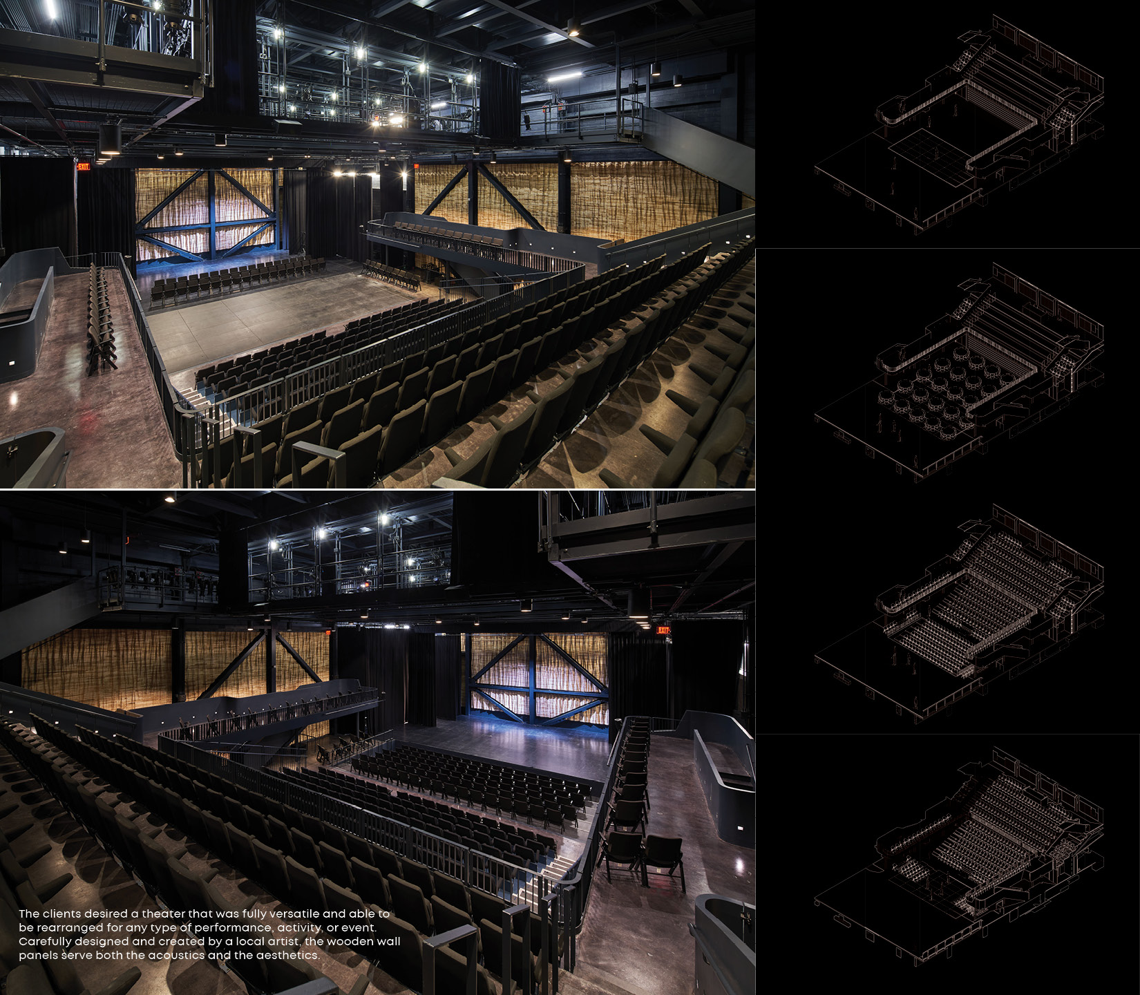 This world-class performance space is designed to be highly tunable and immensely flexible. The space is intimate and accommodates a wide range of performances. The space is supported by theatrical technologies to modify seating, architectural acoustics, amplified acoustics, lighting scenes, and cinema. The sculptural wood acoustical paneling was made up of 9,000 individual pieces and assembled by hand by local artisans.