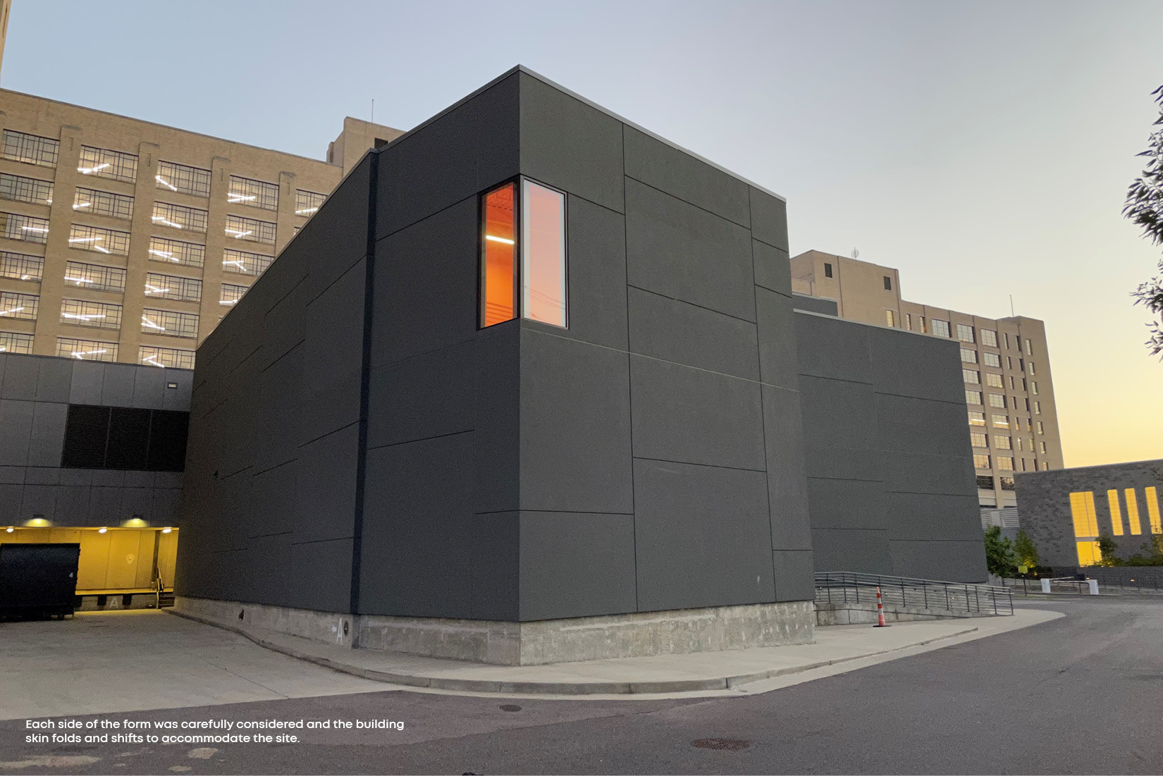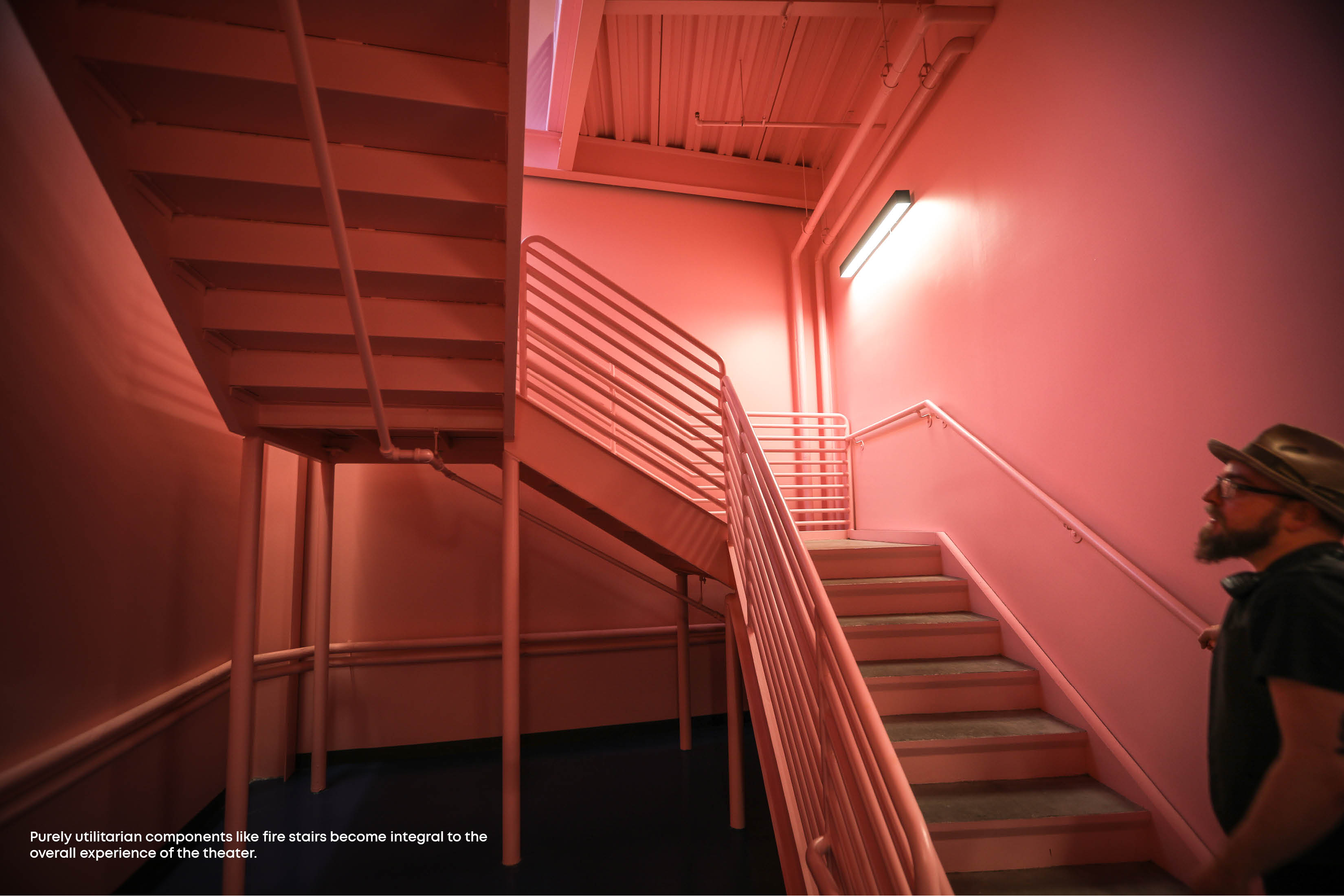 Designed from the inside out, the theater’s interior spaces push the envelope, giving shape to the building’s exterior. The boxy, dark gray exterior is emblematic of the black-box theater. The rake of the seating line inscribed on the west exterior extends beyond the building mass to a cantilevered control room providing shelter over the building’s entrance. Opposite the public face, performers easily access the theater for direct load-in/load-out access along the original rail line path that connected to the powerplant.