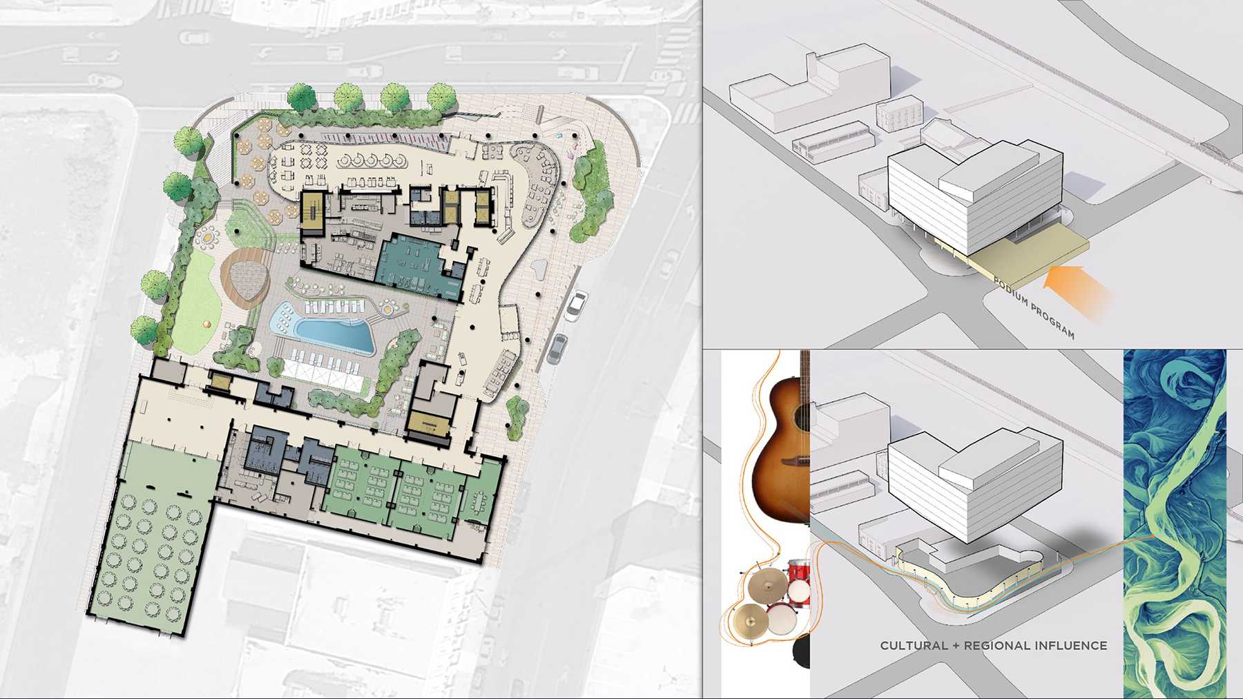 The mass of the hotel is elevated on concrete columns and wrapped around an interior courtyard providing full visibility for ground level amenities through a serpentine glass wall. Shaped to mimic the adjacent riverbank and reference the curves and shapes of musical instruments, the curving glass wall recesses within the hotel perimeter to create a three-sided loggia. This loggia provides covered outdoor spaces for entry canopy and outdoor patio dining at the restaurant with a view overlooking the river. While the facades along Beale and Front respect the tight urban condition, the courtyard facades around the pool deck are more playfully patterned to create a village-like scale and more intimate environment adjacent to the historic buildings.