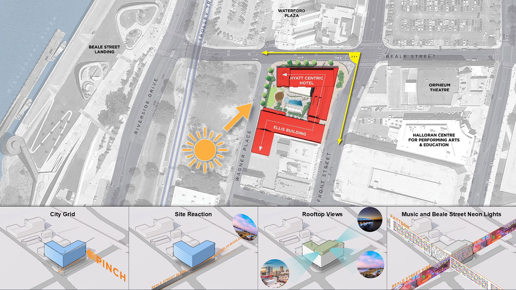The contemporary new hotel design is intended to provide a missing connection of activity and excitement from the Beale Street Historic District to the origin of Beale Street at the Mississippi River. The musically inspired ideas of flow, pitch, meter, rhythm, sound, repetition, vibration, and resonance are found throughout the design. These ideas are expressed in the staggered patterning of the window placement which recall sheet music and guitar fret patterns. These patterns are accentuated at night with bars of light adjacent to the windows which provide a musically inspired programmable light show on the urban facades.