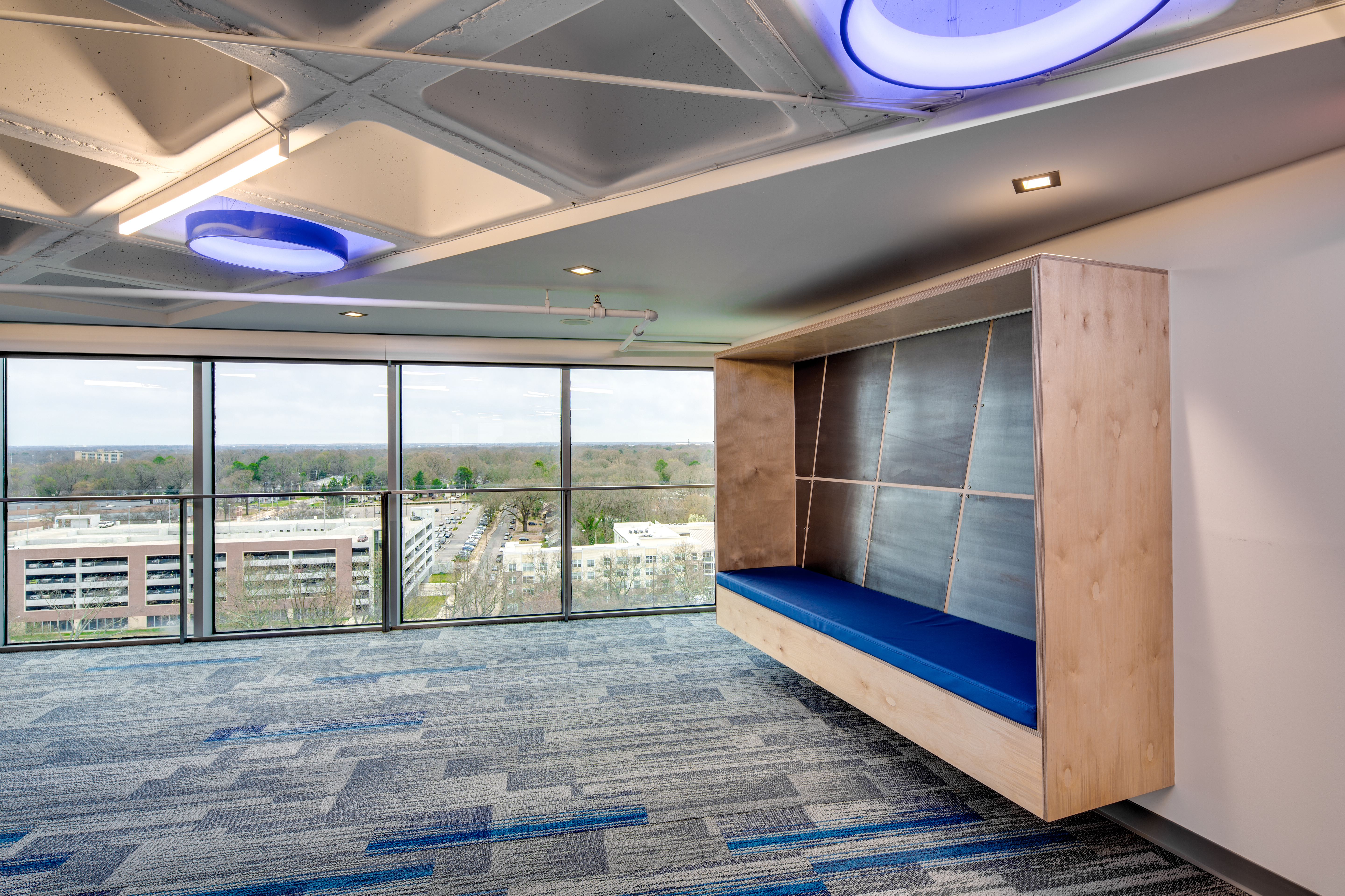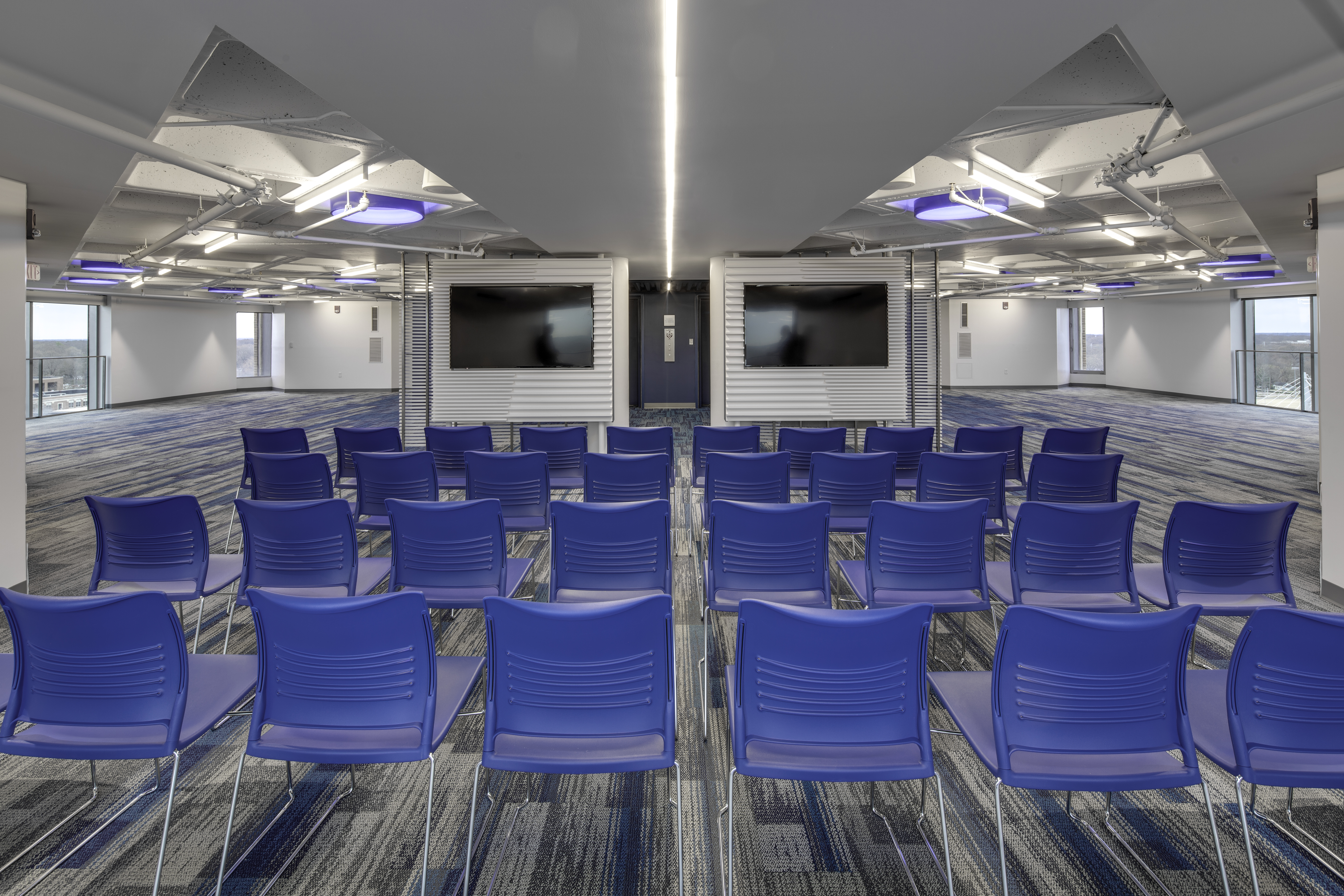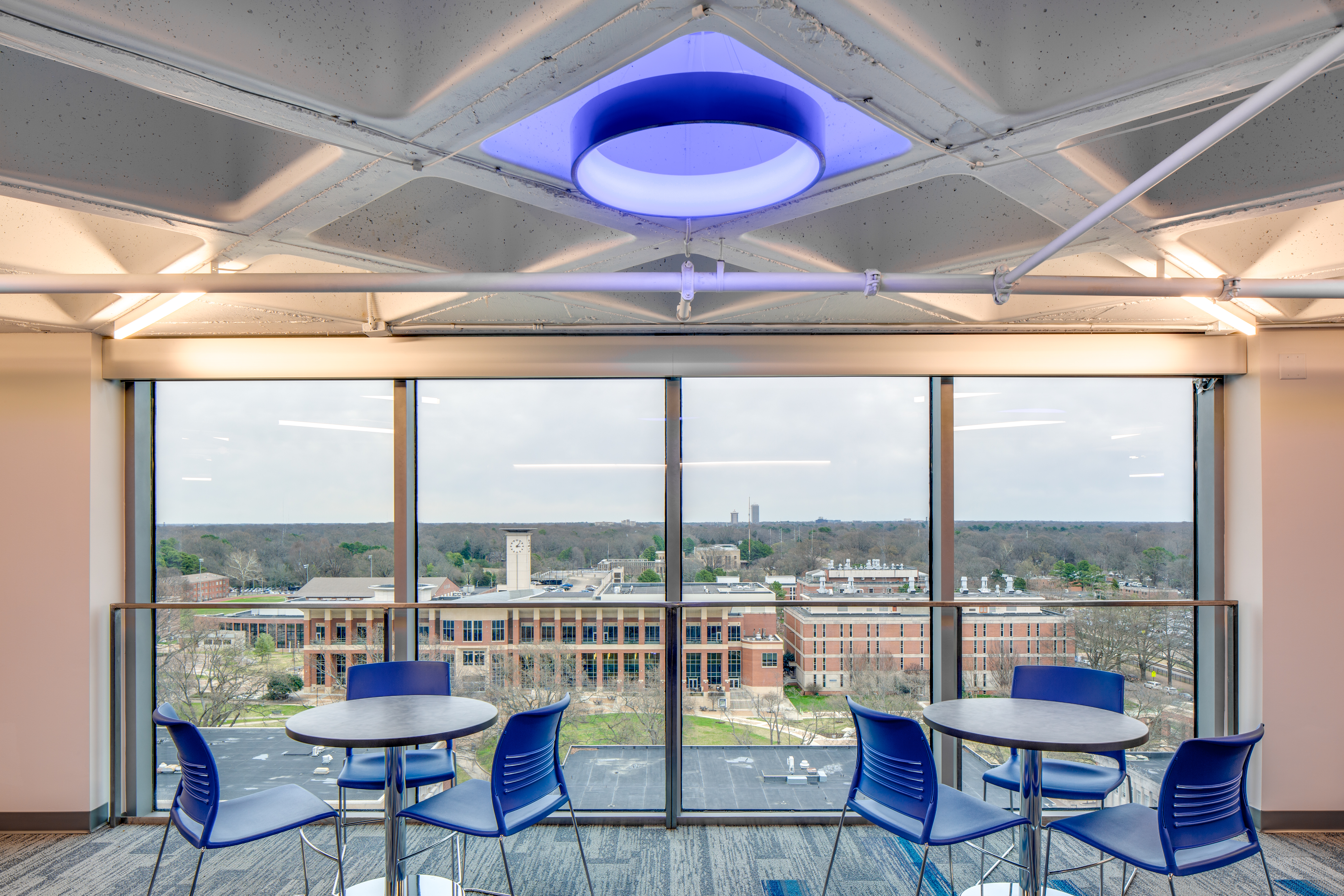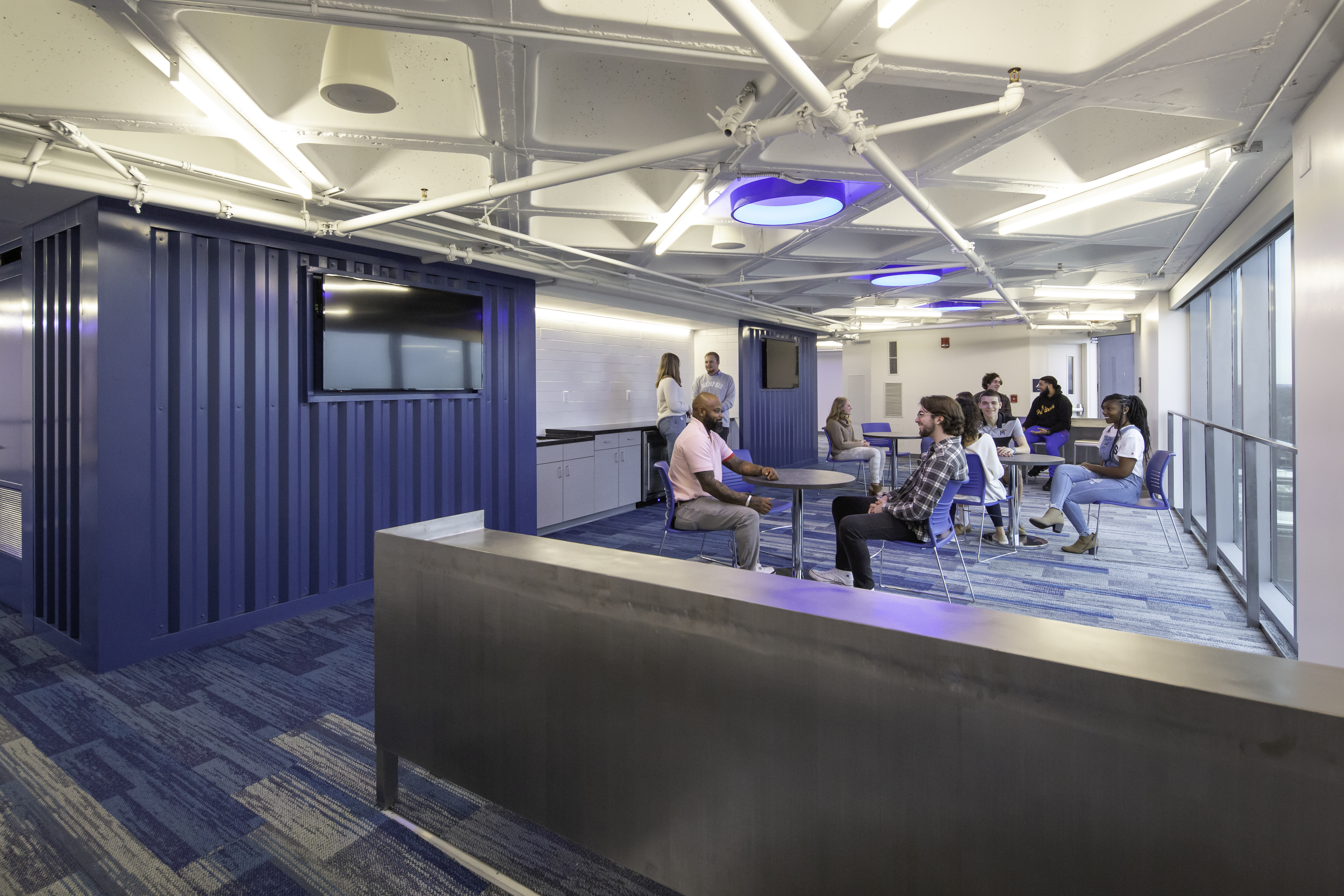 This space offers the user the ability to see the entire campus from one vantage point. The industrial undertones of the design are inspired by the spirit of the City and the University - gritty, vibrant, tough, hospitable, and resilient. The design of Wilder-12 is meant to align with those qualities. University colors are prevalent and set against a backdrop of exposed structure, conduit, piping and other utilitarian devices.