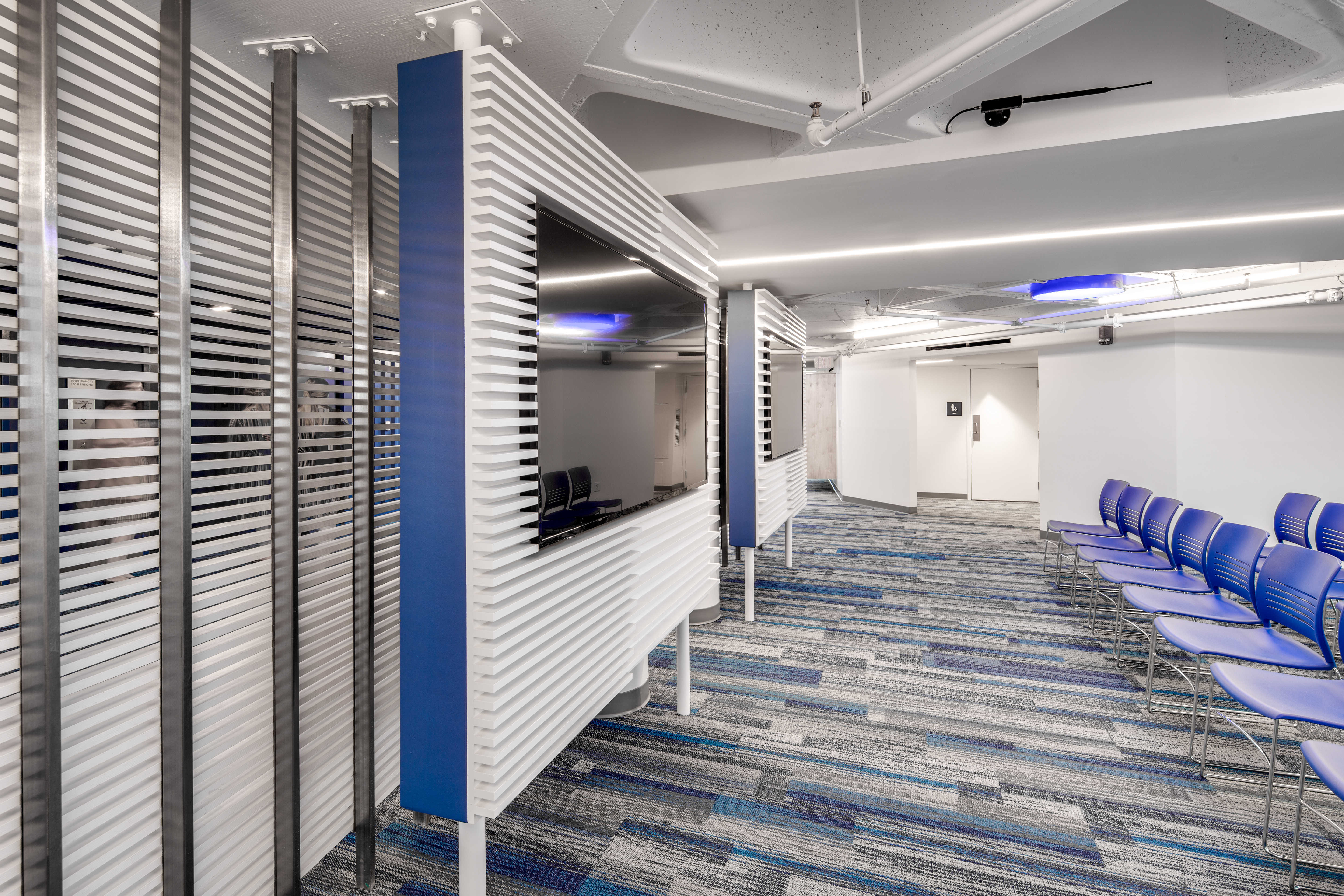 4- Photo by CLR Photography- A slatted screen wall provides semi-privacy between the elevator landing and the presentation area.