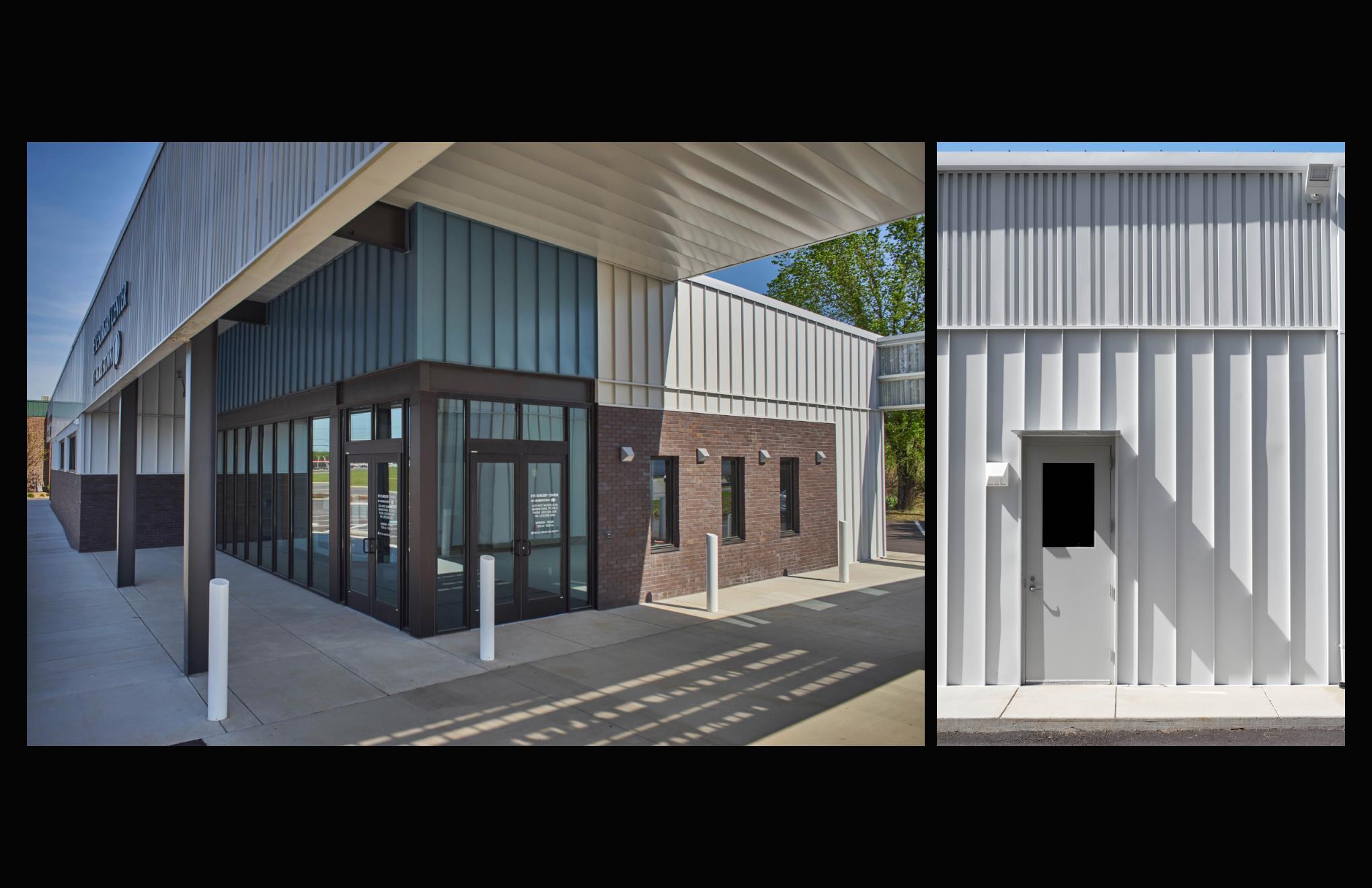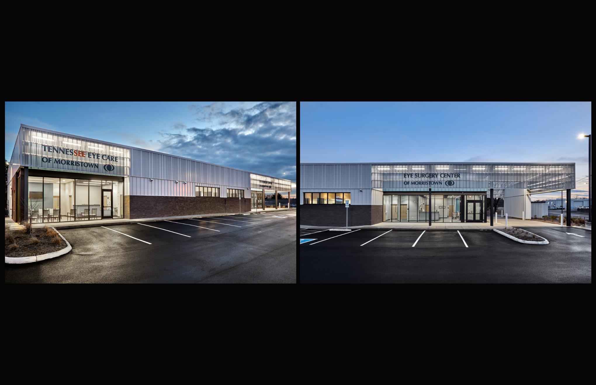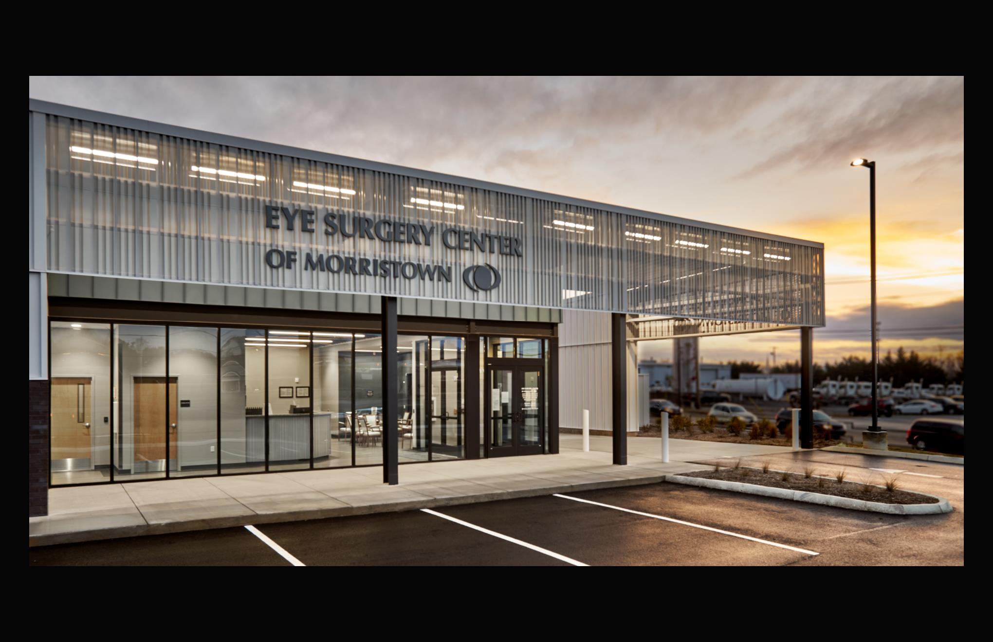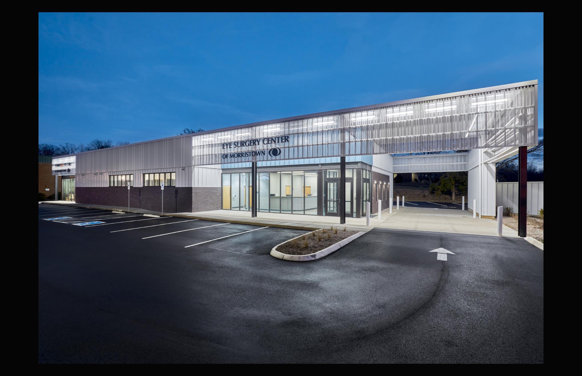 Morristown EYE is an 8,400 sf medical facility split into two tenants. One side of the building is an eyecare clinic, and the other is dedicated to an eye surgery center ASC. The front of the building is largely transparent in order to visually connect the internal occupants with the site and vice versa. The backlit perforated metal facade illuminates the entries and the parking lot and serves as a beacon to the community. A drive-thru drop-off is located on the end of the building adjacent to the surgery center entryway.