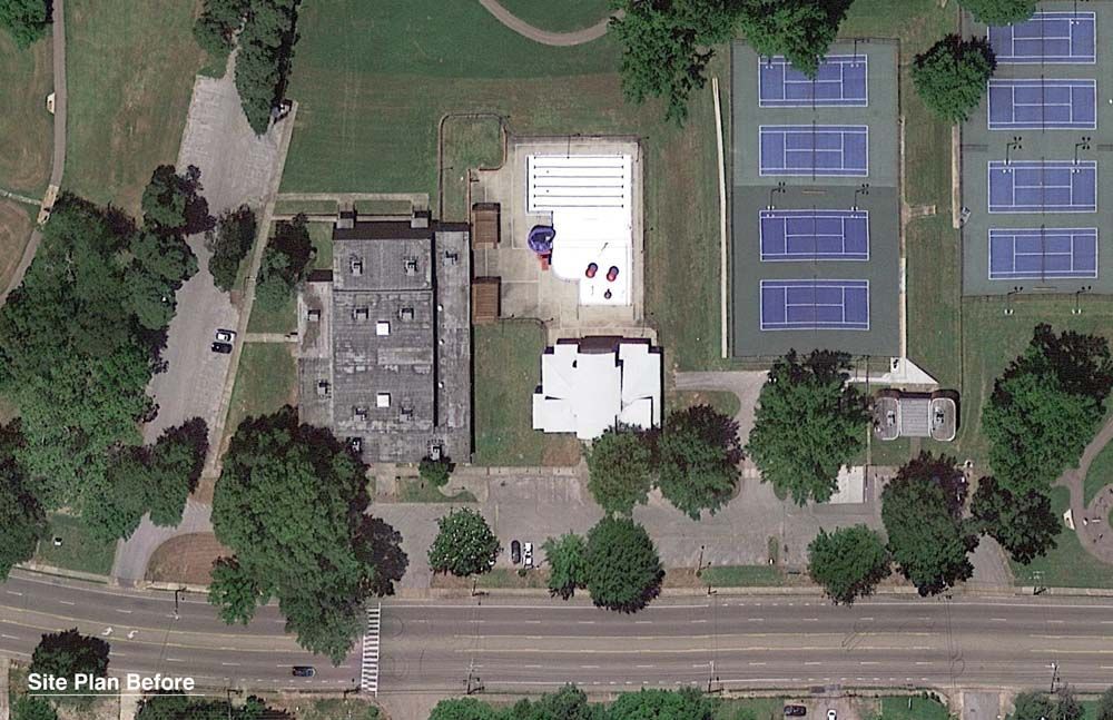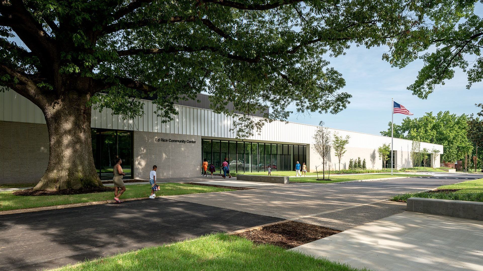 The reimagined Ed Rice Community Center is the newest addition to Frayser Park, a site steeped in history, revealed in the unusual planning of the park and the aging structures scattered along the western edge of Watkins Street. Situated between Frayser Park and the community’s residential neighborhoods, the aging 1965 center consisted of an opaque brick gym around which accessory spaces were arranged. To the north, a separate, newer aquatic center and midcentury tennis center had been constructed in a piecemeal fashion, giving the public face of the park no sense of identity, threshold, or connectivity.